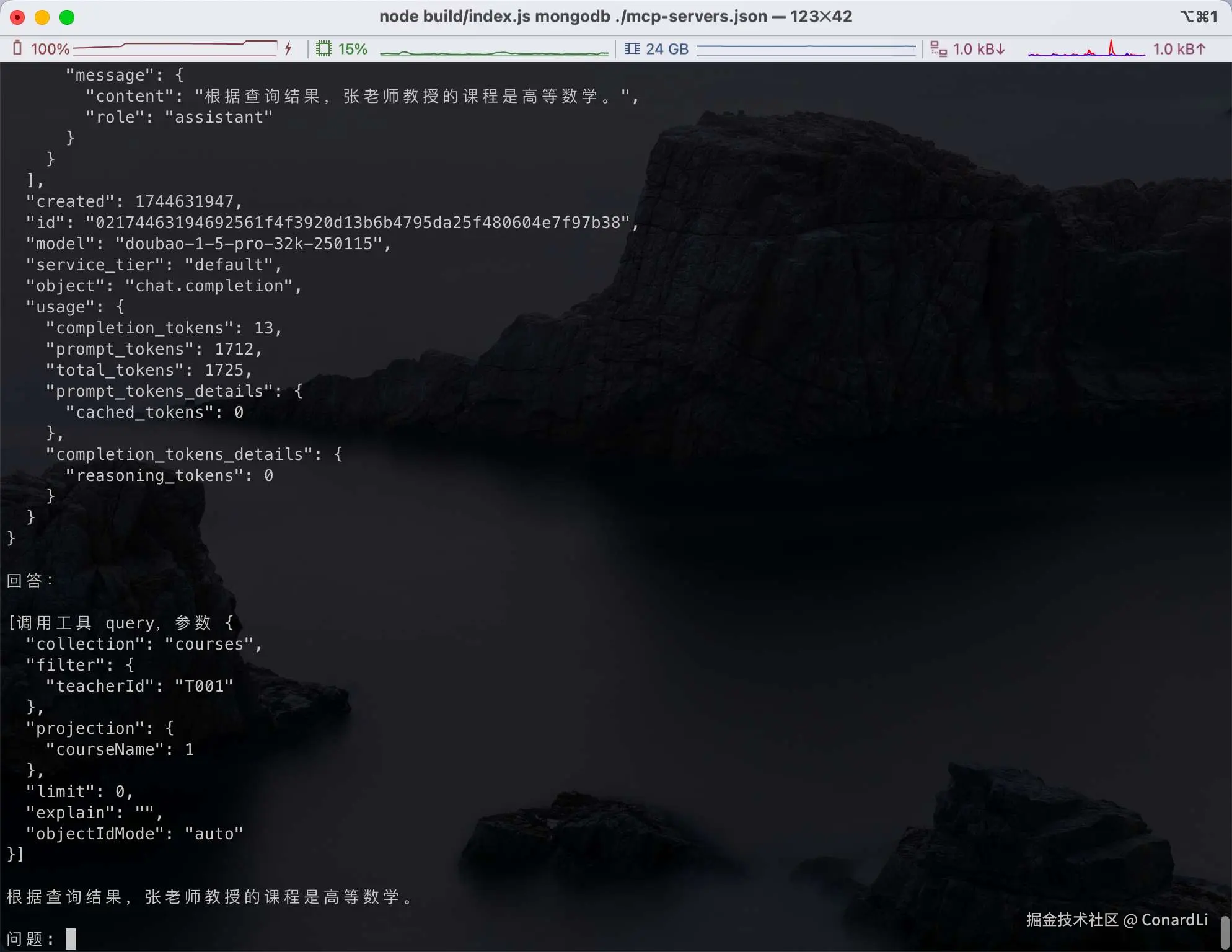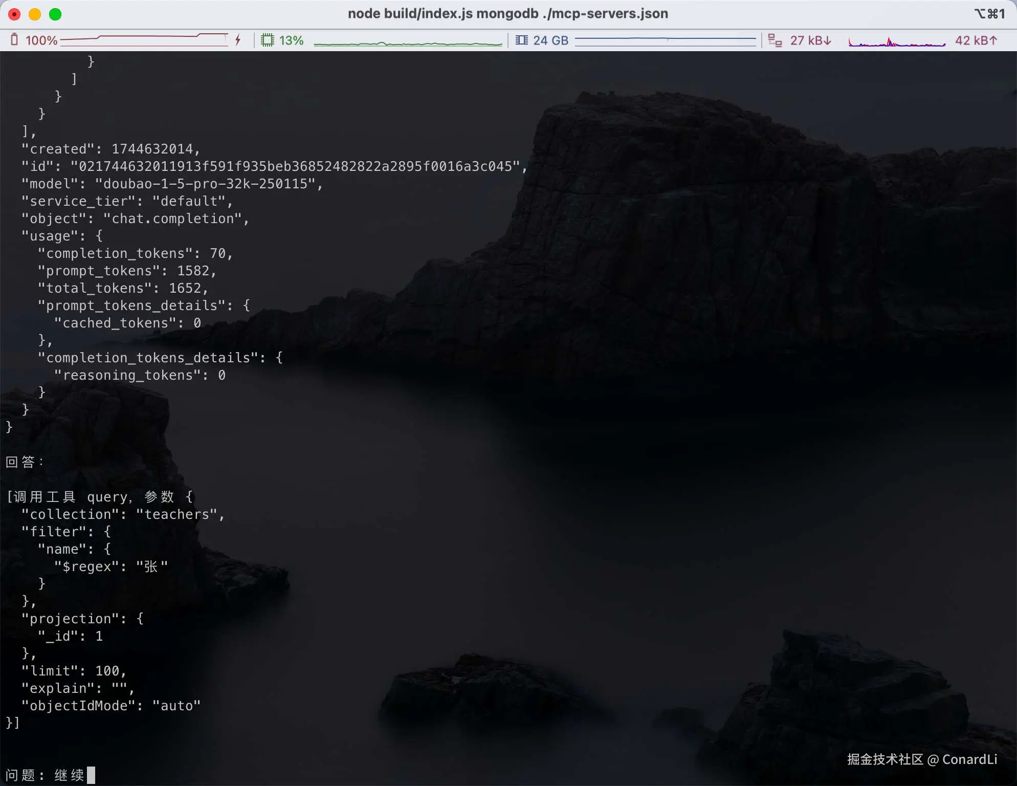 然后执行 node build/index.js mongodb ./mcp-servers.json,客户端成功启动: