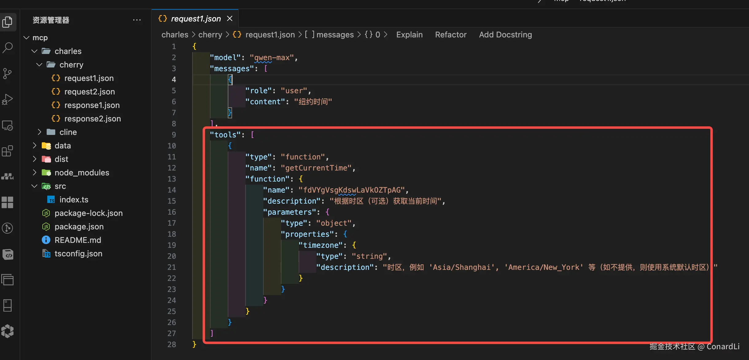 [1] [LLM Request]:向大模型发送 用户问题,并将所有工具列表(包含函数+参数的具体定义)通过 tools 字段传递过去:
