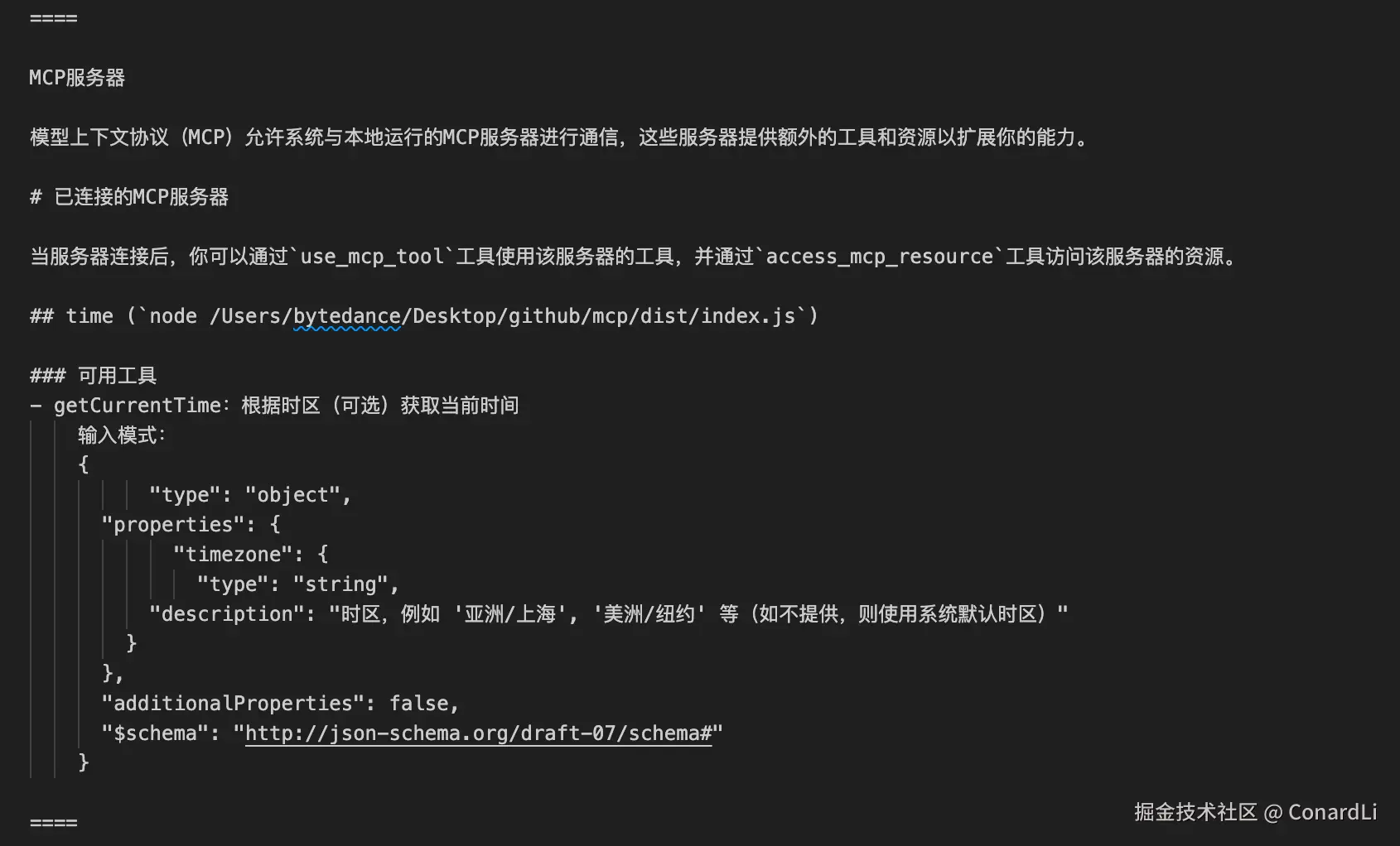 前面的部分都是我们在 MCP Server 中配置的内容,属于固定的部分。而大模型做的,就是根据用户当前的输入,以及当前支持的 MCP 工具列表,判断出要不要调用这个工具,如果要调用,生成结构化的工具参数,最后 MCP Client 通过 STDIO 协议将这个结构化的参数再传递给 MCP Server。