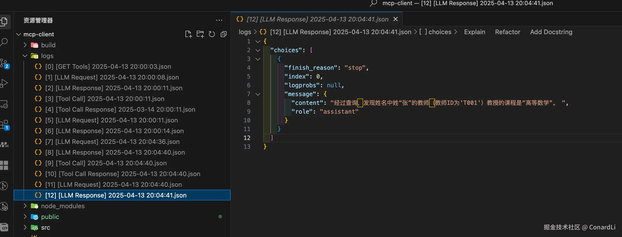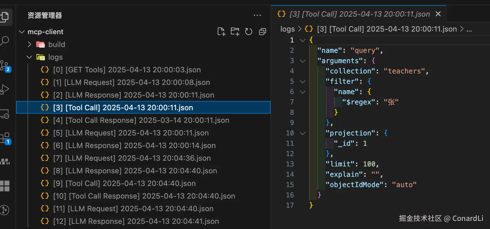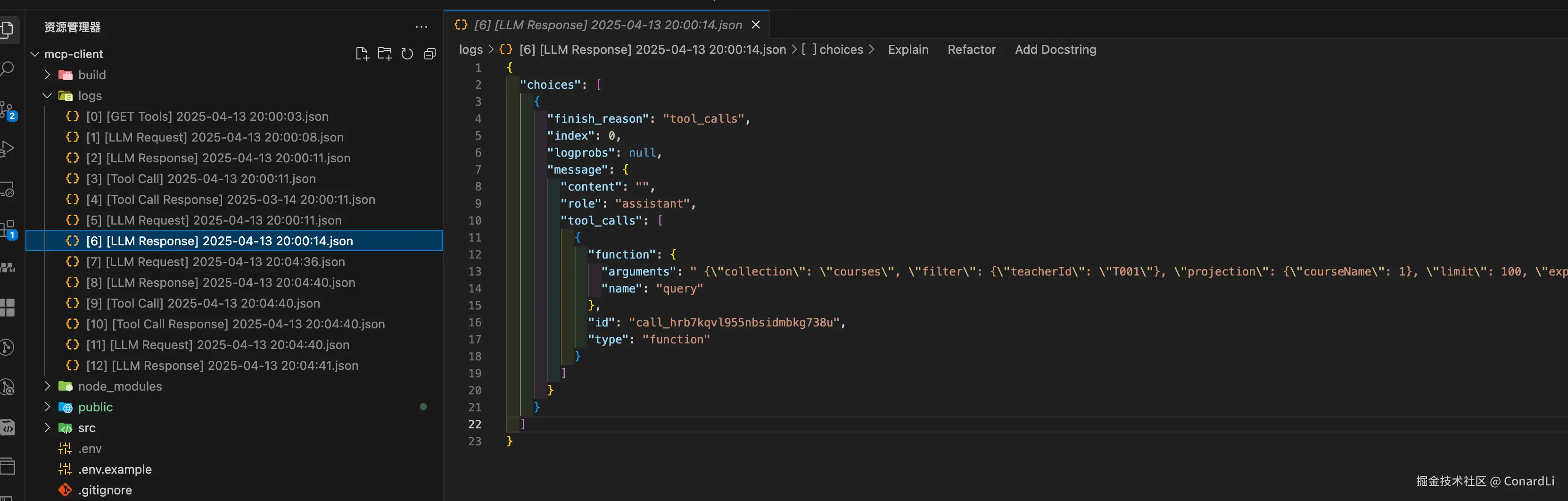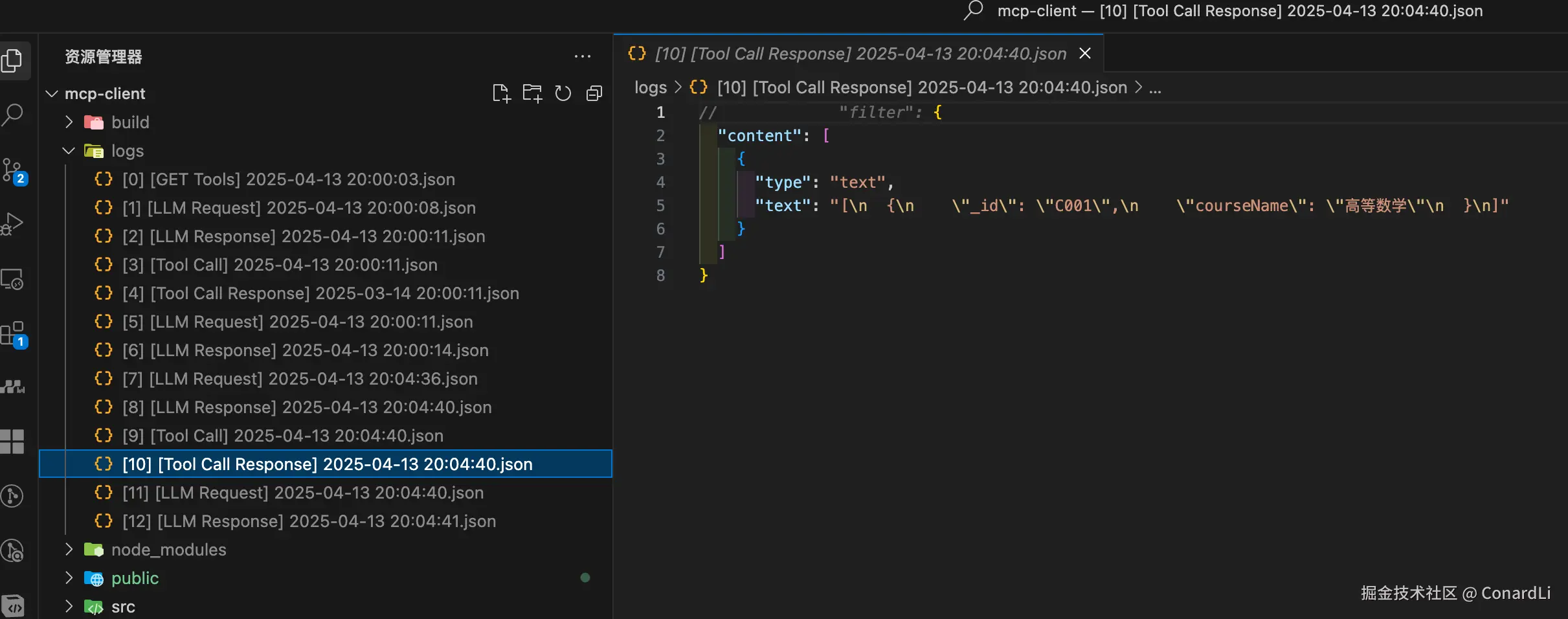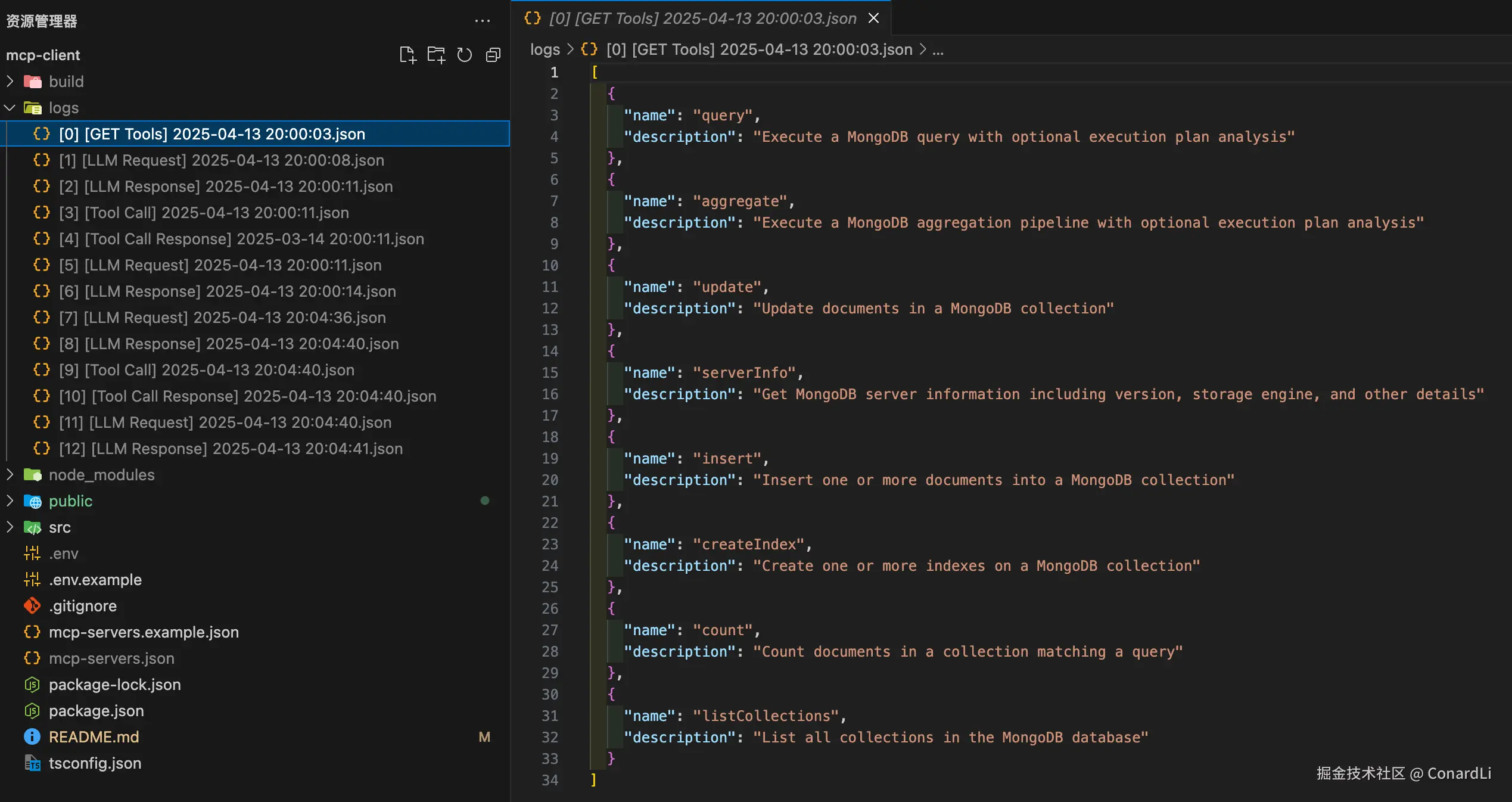 MCP Client 包含一个全面的日志系统,详细记录所有关键操作和通信。日志文件保存在 logs/ 目录中,以 JSON 格式存储,方便查询和分析。