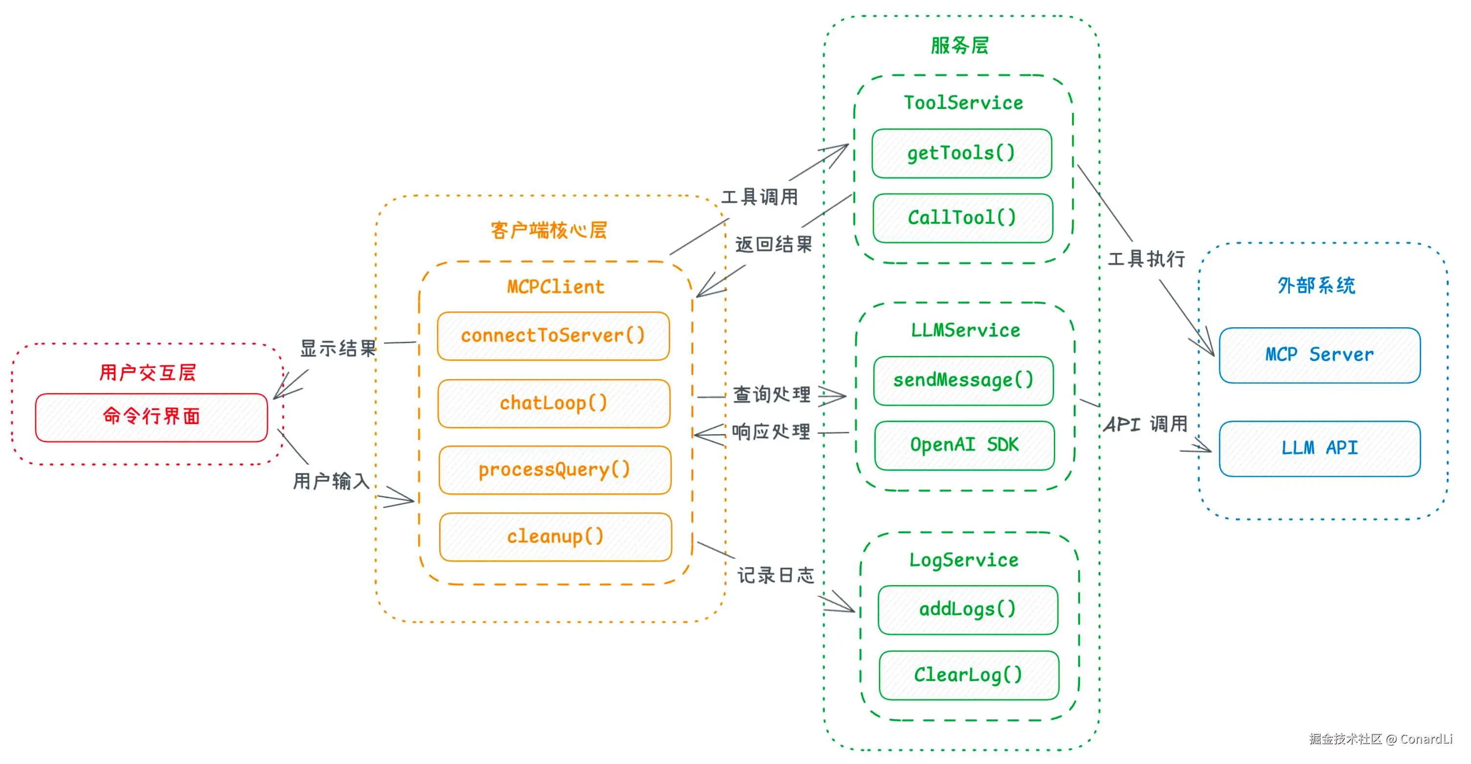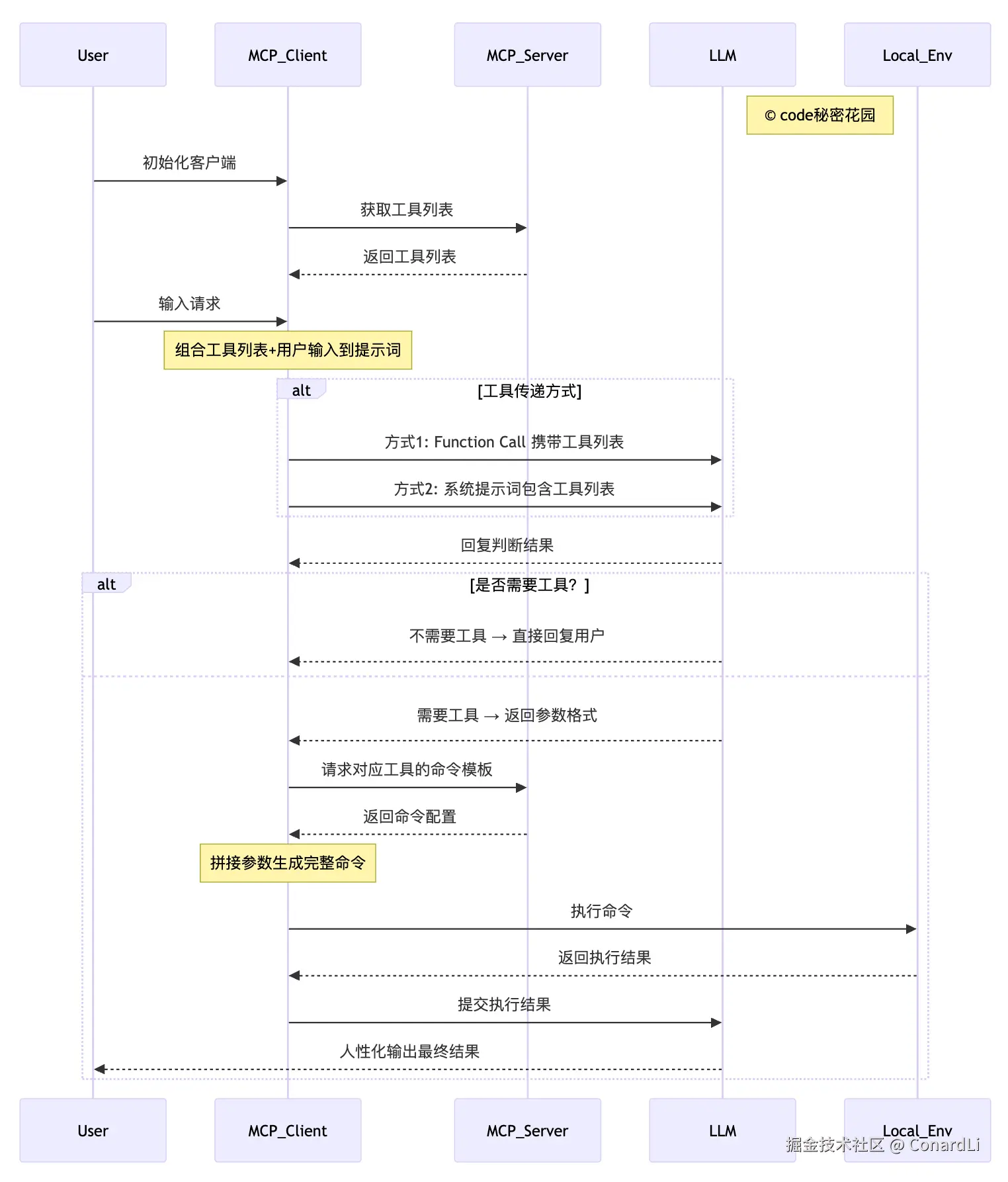 - 结果处理:本地系统 返回原始执行结果(如命令输出文本、API返回数据),ToolService 将其转换为 结构化结果(如JSON格式),反馈给 MCPClient。
