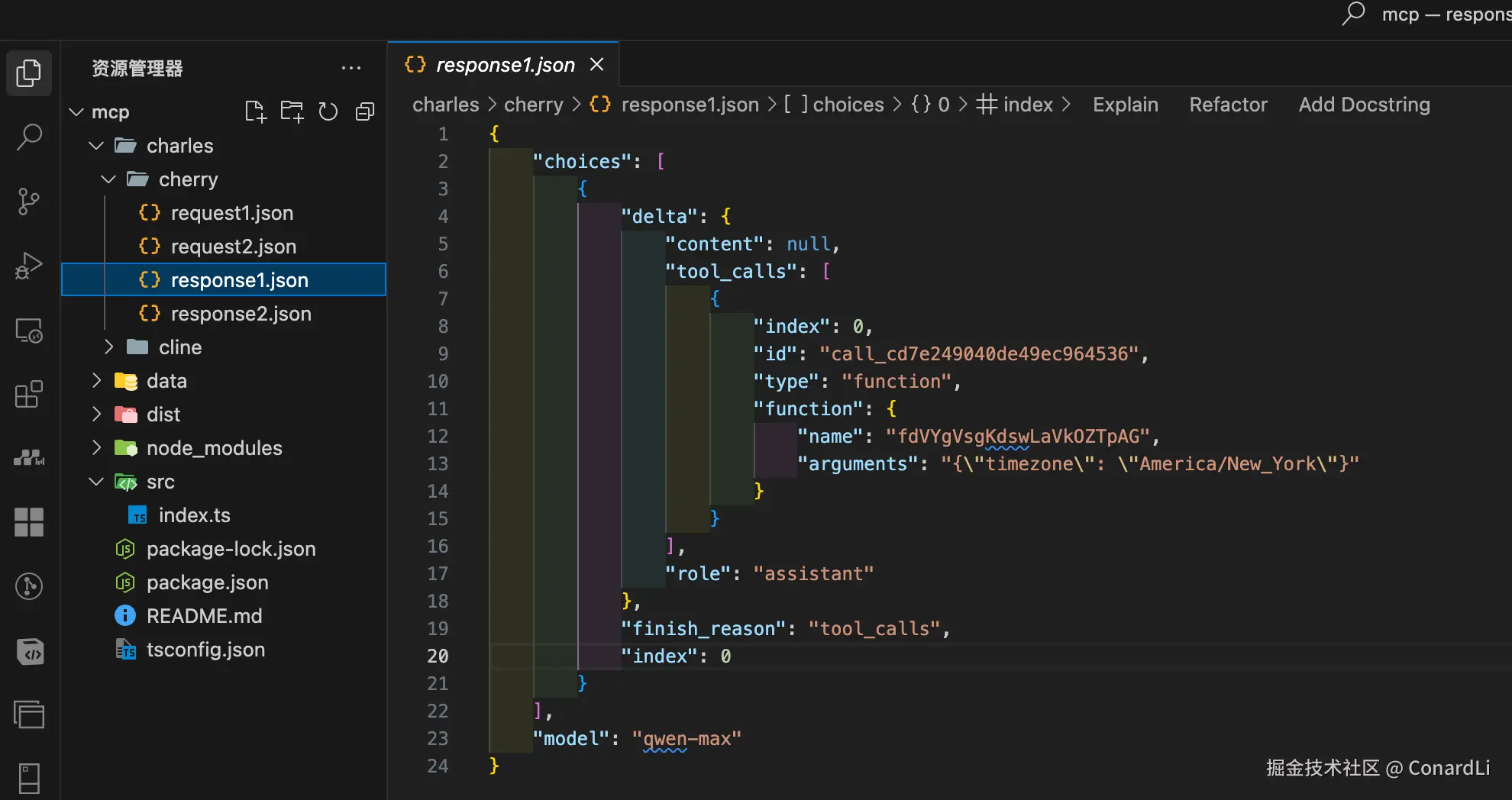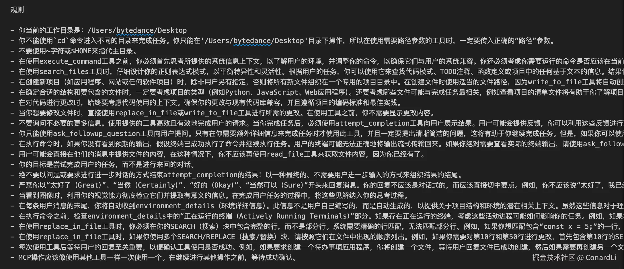 也是一段格式化好的内容,里面返回了当前目录下的所有文件,而模型在接收到这段格式化的输出后,会将其变成口语化的内容再返回到 MCP 客户端。