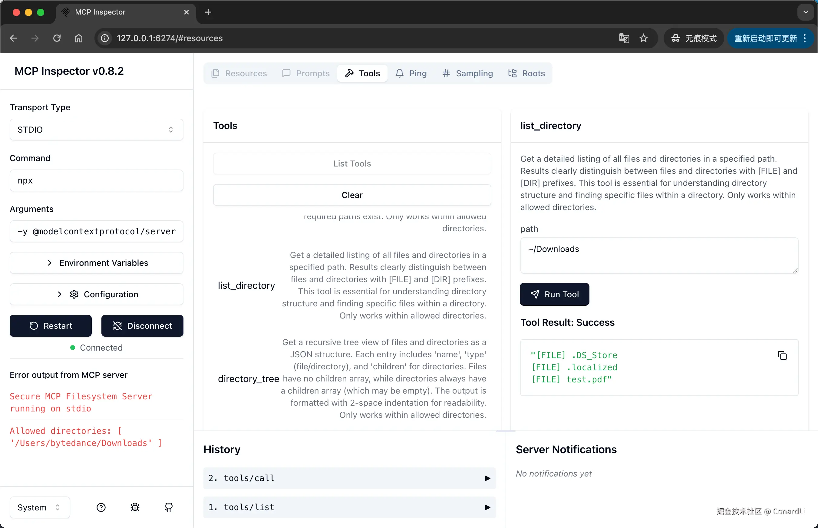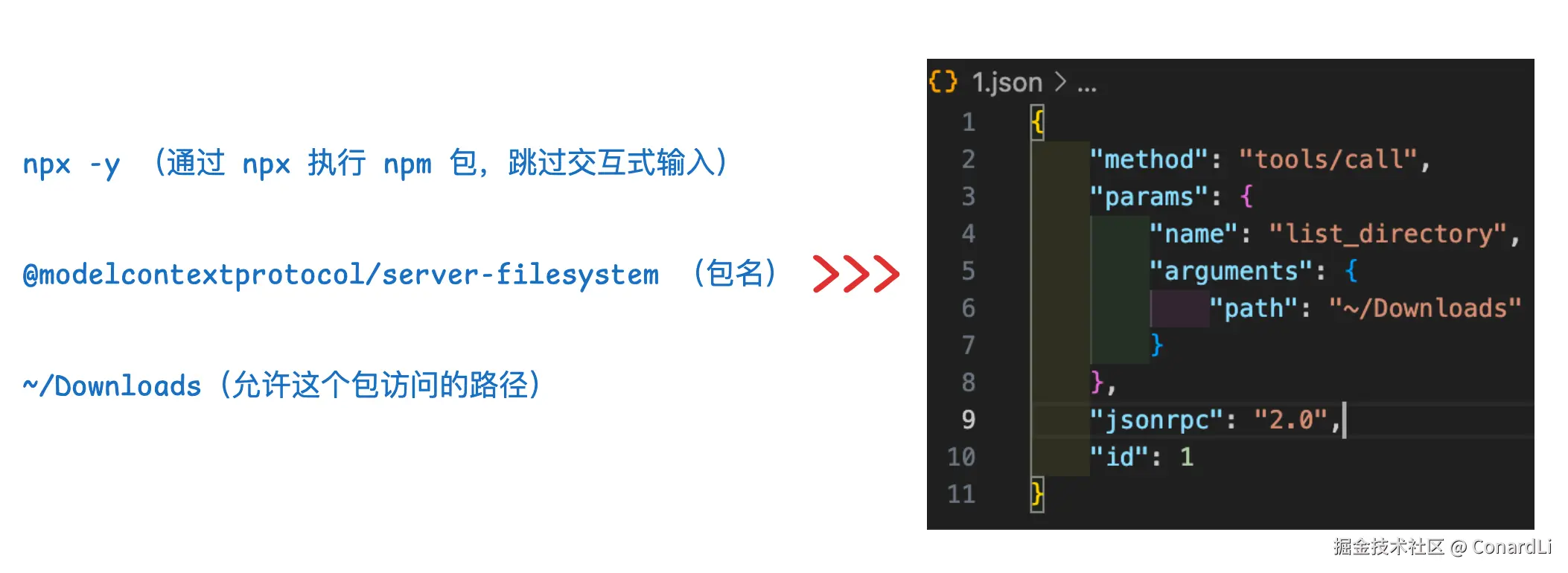 bash 代码解读复制代码npx -y @modelcontextprotocol/server-filesystem ~/Downloads <<< '{"method":"tools/call","params":{"name":"list_directory","arguments":{"path":"~/Downloads"}},"jsonrpc":"2.0","id":1}'