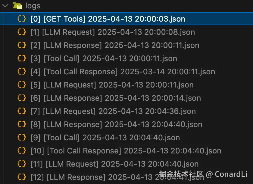 日志文件连统命名为 [index] [log_type] YYYY-MM-DD HH:MM:SS.json,包含序号、日志类型和时间戳,方便按时间顺序查看整个会话。
