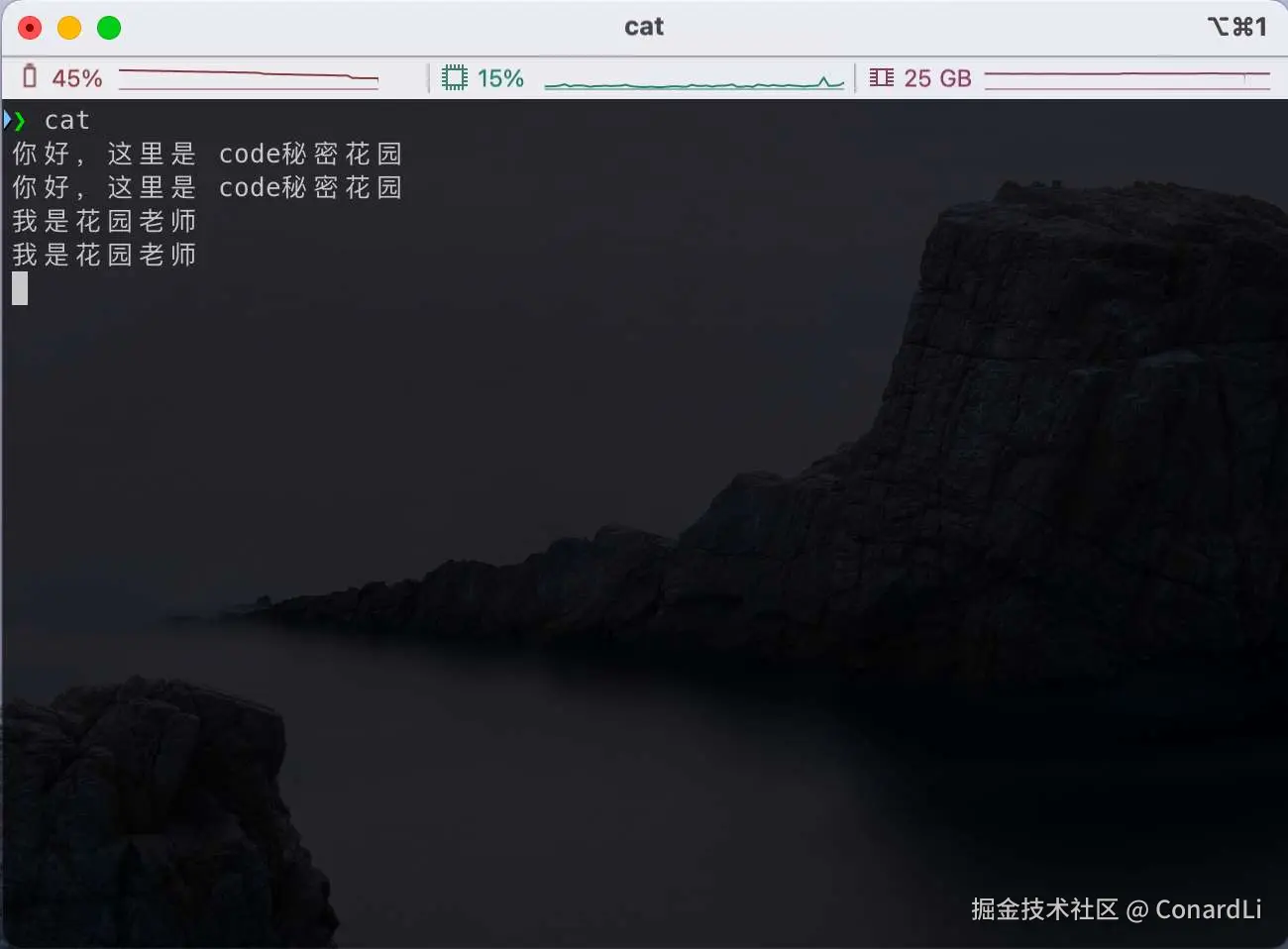 在这个例子中,你输入了 你好,这里是 code秘密花园! 和 我是花园老师,cat 命令将这些内容从标准输入读取后,马上输出到标准输出。