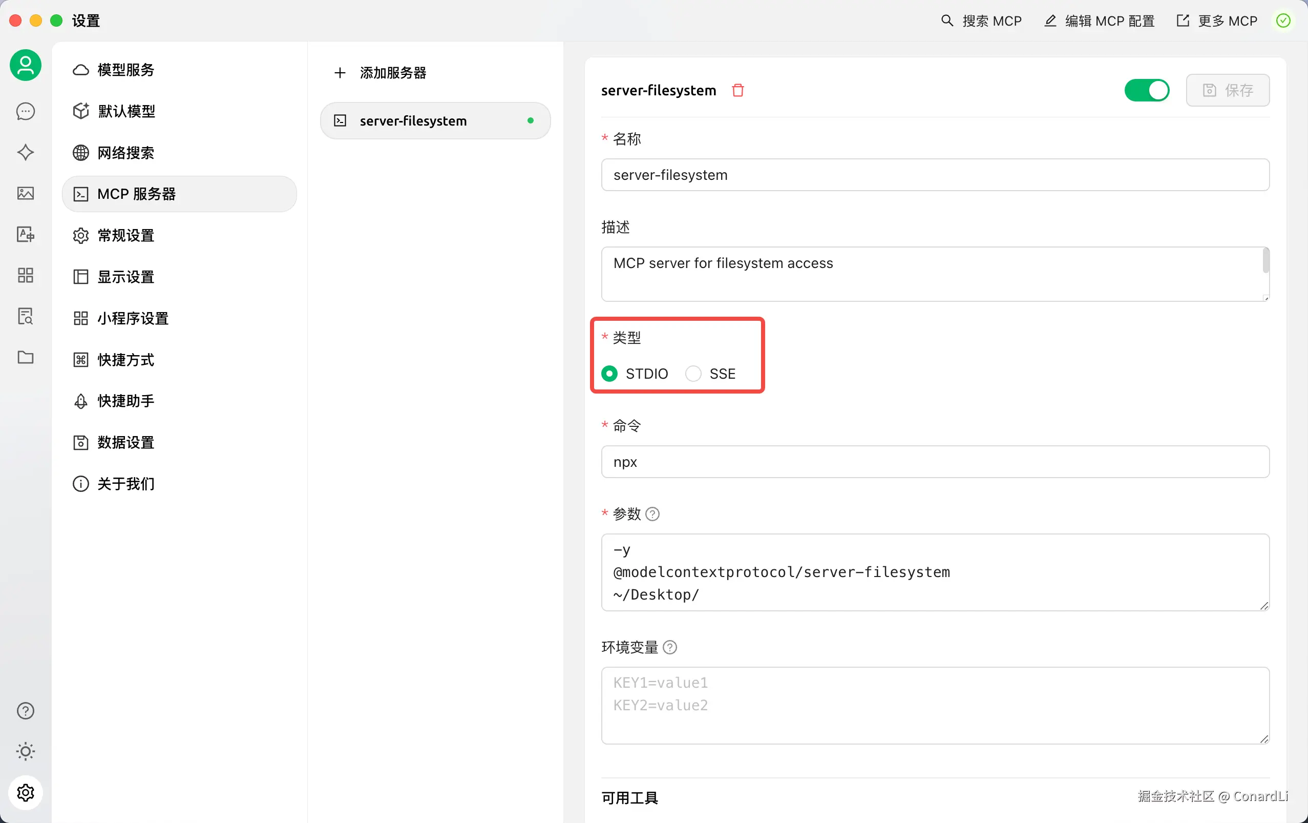 我们使用 Cherry Studio 中的 MCP 服务配置来举例,最前面的名称和描述比较好理解,都是用于展示的。