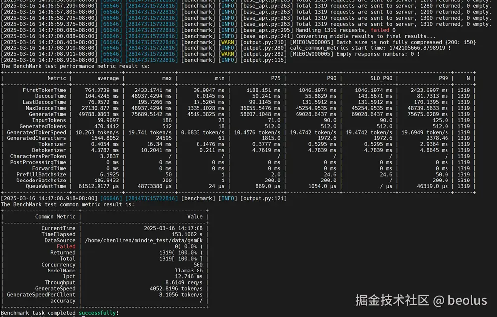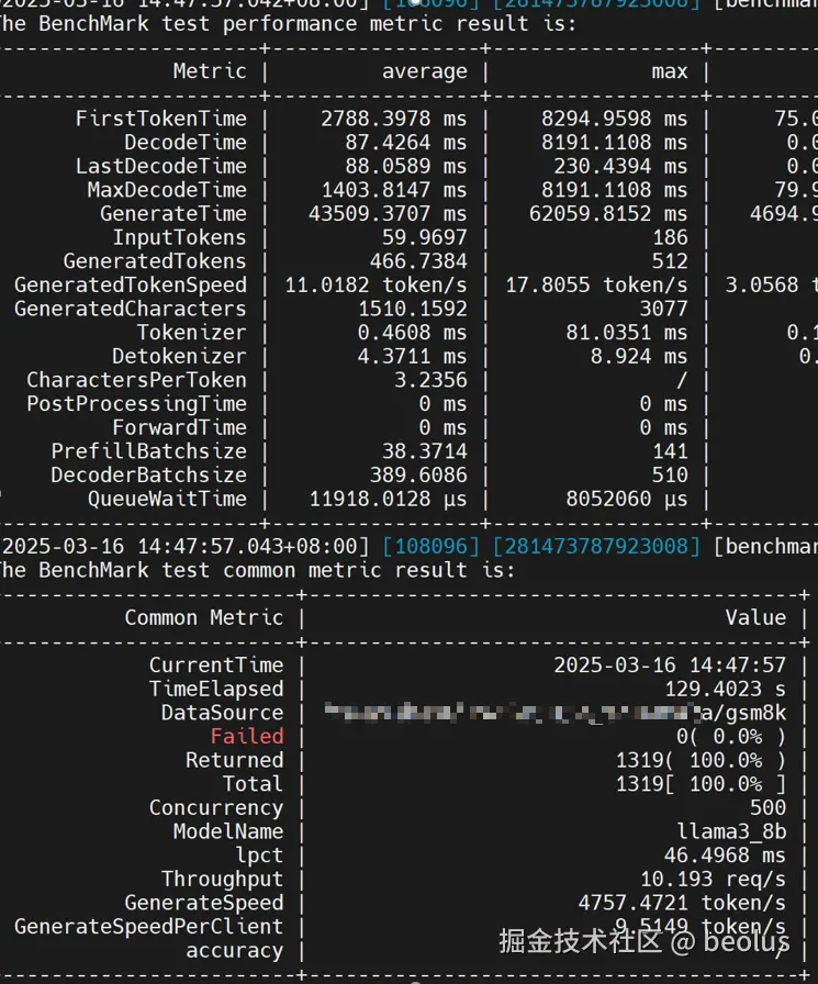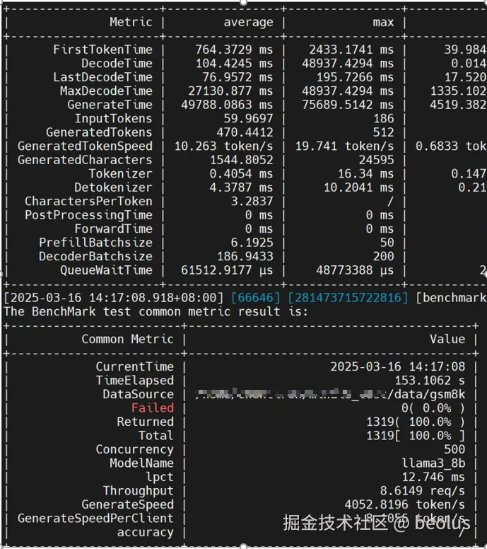 从下面benchmark信息获取数据集信息: InputTokens: 60(avg), 186(max), 23(min) OutputTokens: 467(avg), maxIterTimes(max), 18(min)