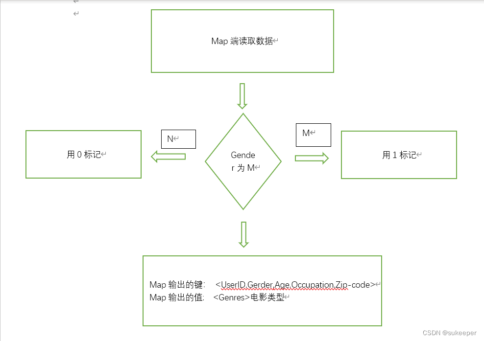 我们的目的是根据电影类型来预测用户的性别,换句话说,预测用户的性别需要知道用户看过的那些类型的电影最多,所以对用户看过的电影数据类型进行统计,但是我们没有直接的数据,需要从三份数据里面提取的需要的信息。如下图:
