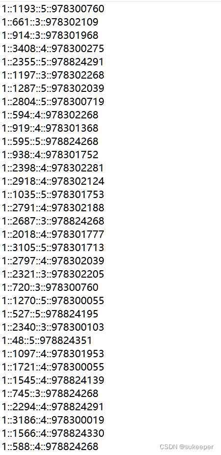 用户对电影的部分评分数据ratings.dat如下图所示。该数据包含四个字段,即UserID(用户ID)、MovieID(电影ID)、Rating(评分)及Timestamp(时间戳)。其中,UserID的范围是1~6040,MovieID的范围是1~3925,Rating采用的是五分好评制,即最高分为5分,最低分为1分。