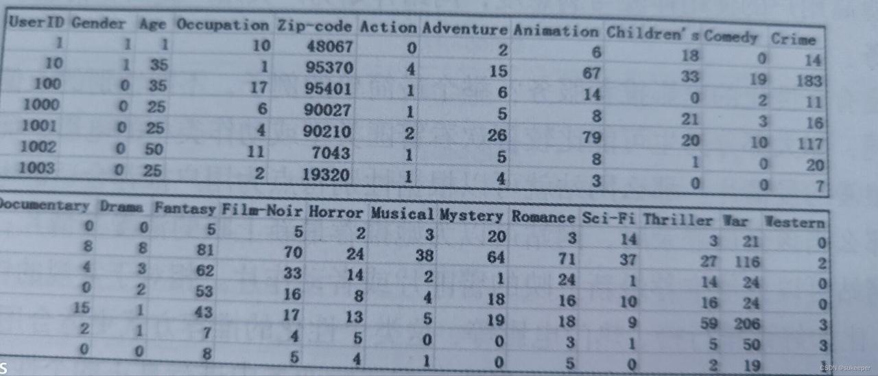 如下图所示,数据是根据每个用户的性别信息及该用户看过的电影类型的统计情况。其中,UserID代表的是用户ID;Gender代表的是用户性别,其中1代表的是女性,0代表的是男性;Age代表的是用户的年龄;Occupation代 代表的是用户的职业;Zip-code代表的是用户的地区编码;从Action到Western代表的是电影的不同类型。列如,某条记录中Action的字段值是4,则说明该用户看过4部动作电影。
