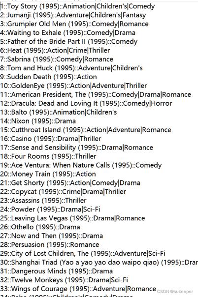 部分电影数据movies.dat数据如下图所示,该字段包括MovieID(电影ID),Title(电影名称)。Genres(电影类型)三个字段。其中,Title字段不仅记录电影名称,还记录了电影上映的时间。数据中总共记录了18种电影类型,包括喜剧片、动作片、警匪片、爱情片等。