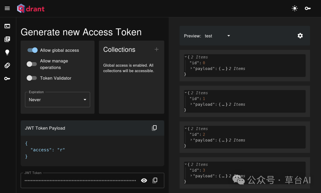 使用 Qdrant Web UI 生成和管理访问令牌: