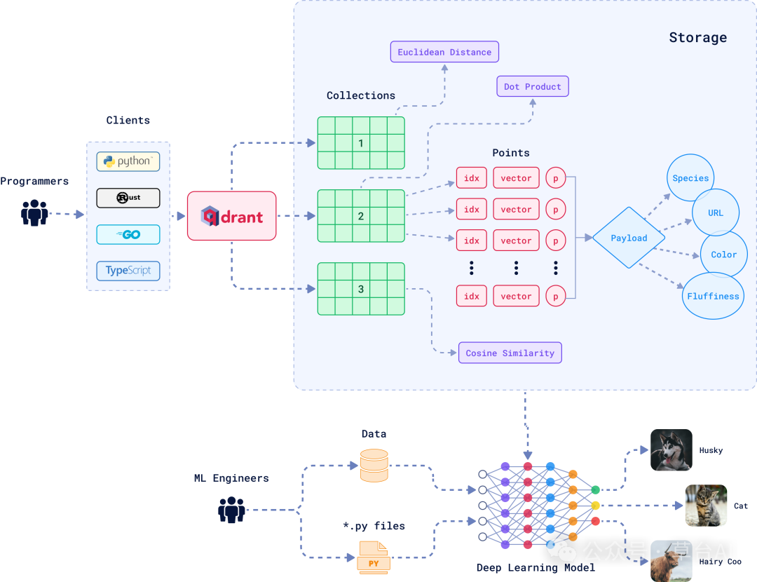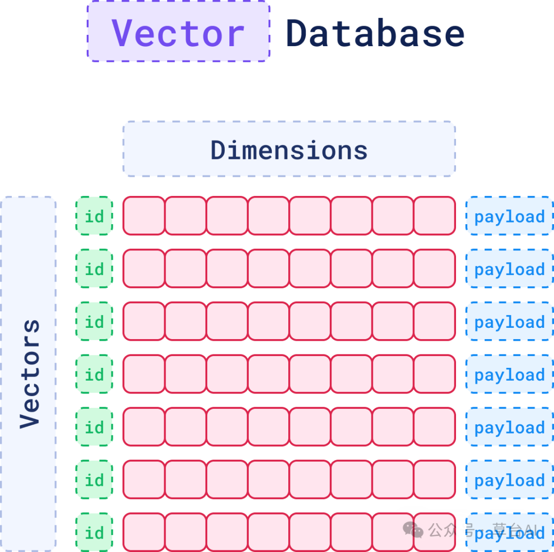 • 每个向量由ID(唯一标识)、维度(数值表示)、有效负载(元数据)组成。