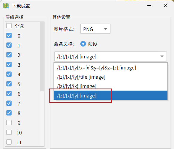 下载地图,注意选择/{z}/{x}/{y}.[image],因为qml的组件Map默认支持这种格式显示