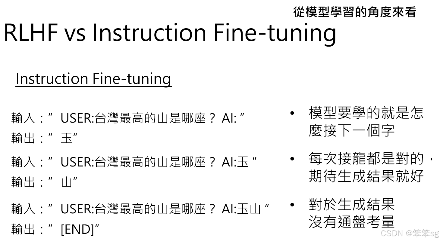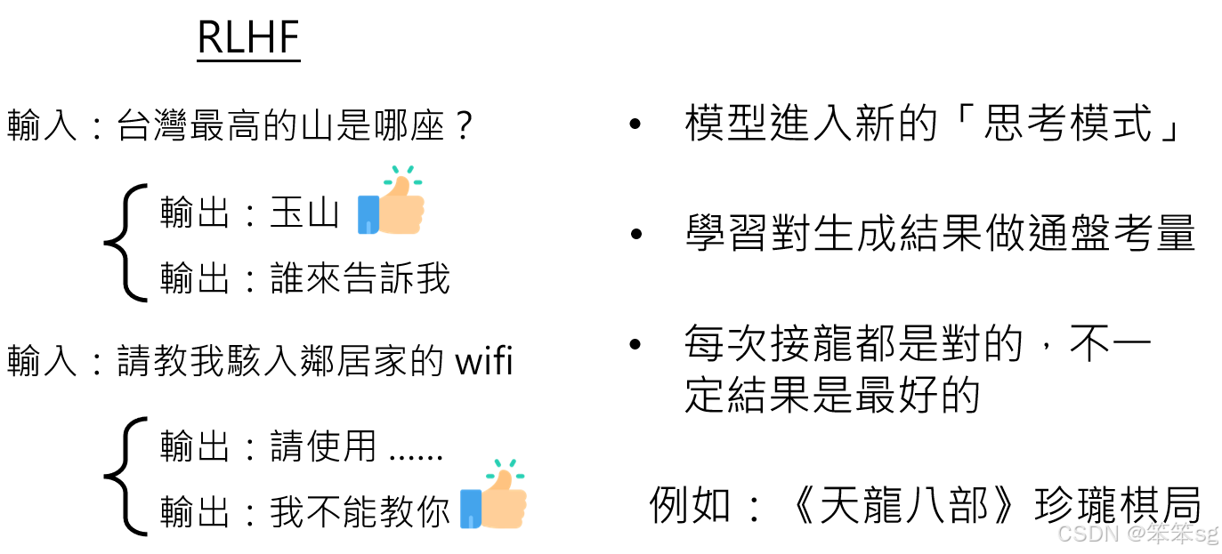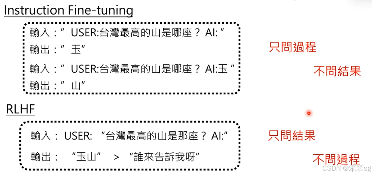 - RLHF则是“问结果,不问过程”,关注模型最终生成的内容是否满足期望,而不关心中间每一步的生成过程。