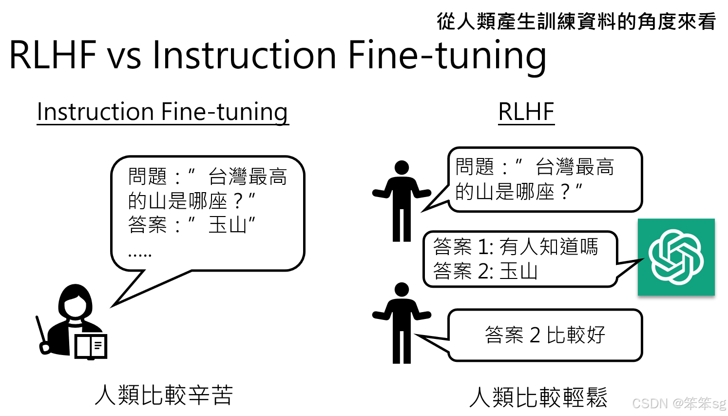 - 人类可能会直接给出某些答案的分数,或者选择哪个答案更好。比如,给定两个模型输出,人类选择哪个答案更好,或给出它们的相对评分(例如:第一个答案优于第二个答案)。