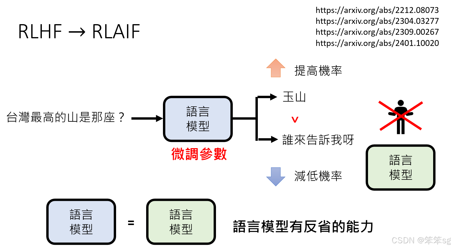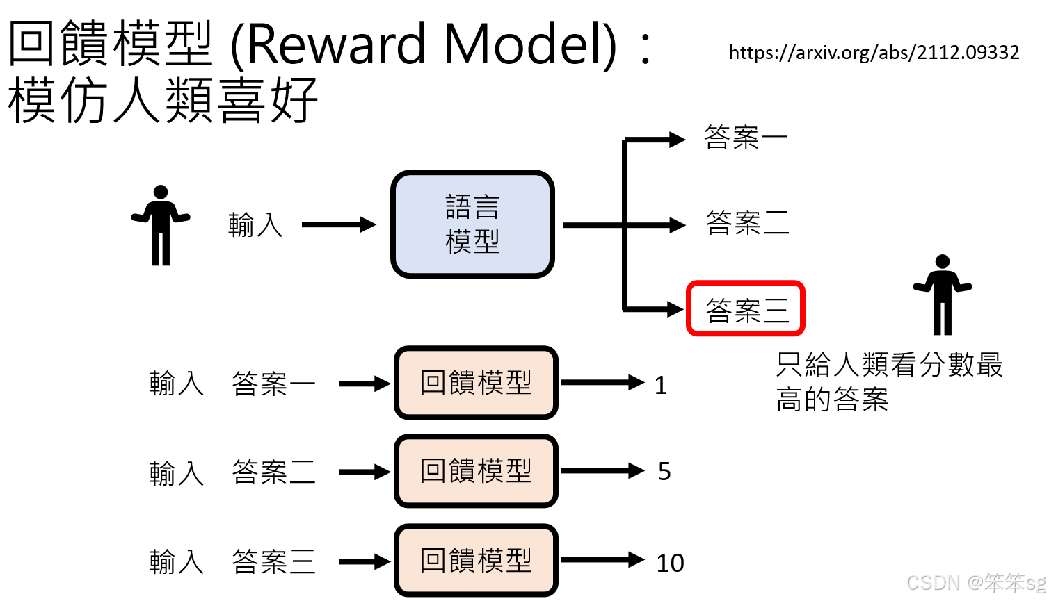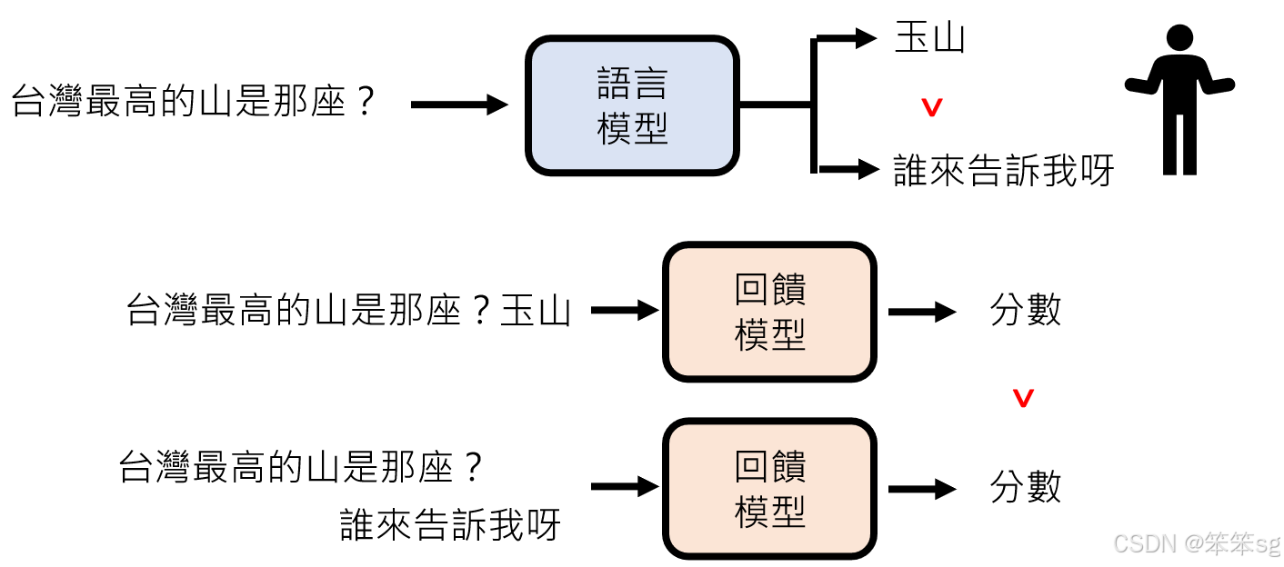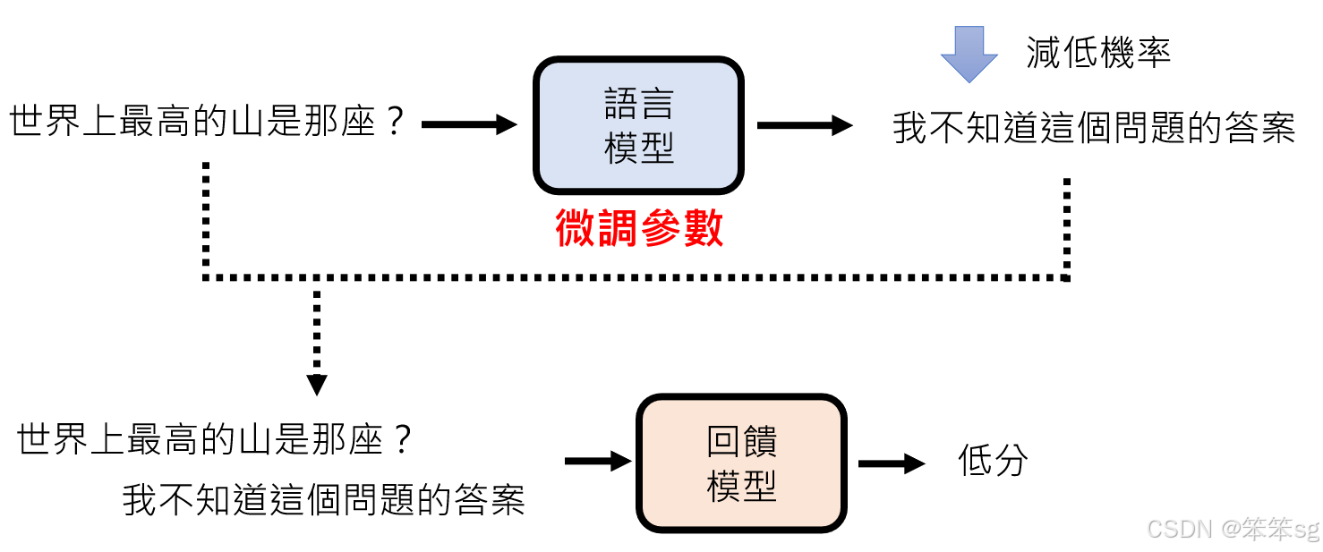 - 如果回馈模型给出的分数较高,表示这个答案符合人类的喜好,语言模型就会微调其参数来增加产生类似答案的几率。