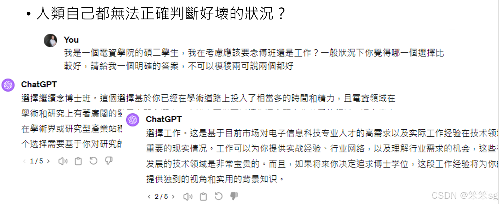 2. 回馈的偏见和不准确性:在这种情况下,人类的回馈可能并不总是正确的。例如,在选择博班还是工作的决策中,人类的偏见可能会影响回馈的质量。如果人类的回馈基于个人经验或文化背景,可能会误导模型,使其偏向某一方向,进而影响模型的学习和进步。