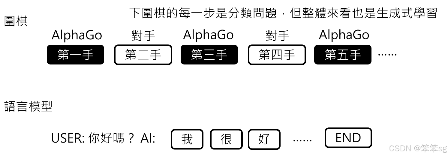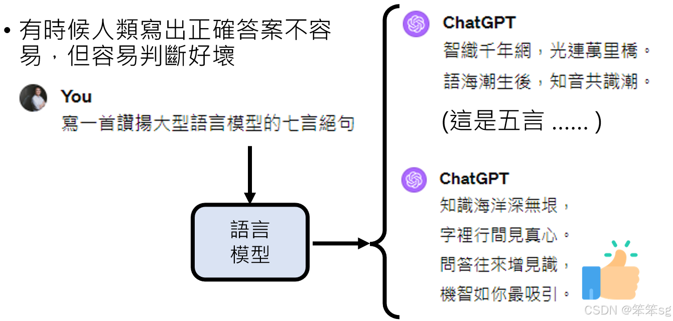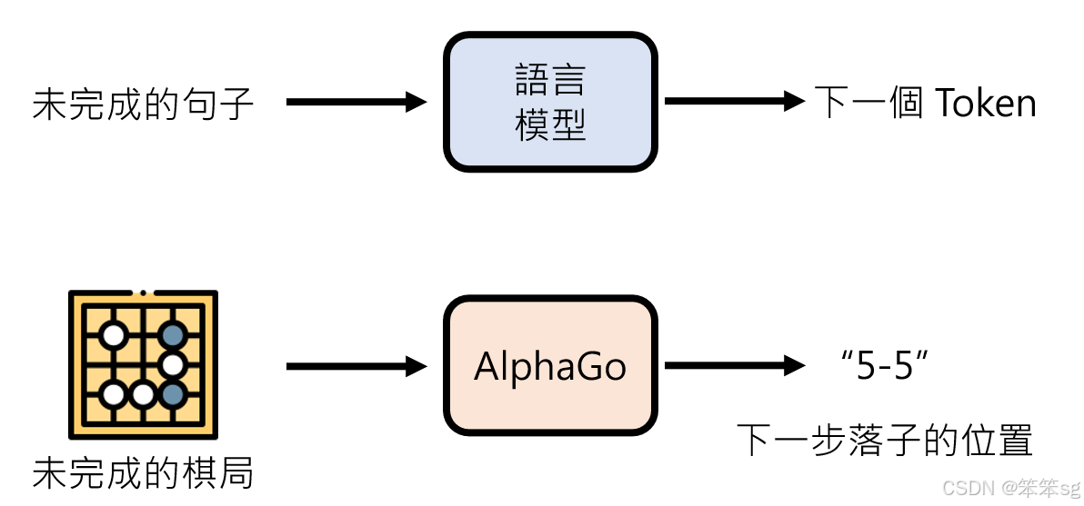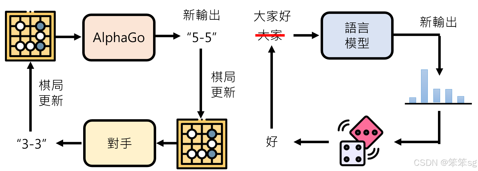 - 这一点的区别在于,围棋的输赢有明确的标准,而语言生成的好坏常常没有绝对的标准,更多依赖人类主观评价。