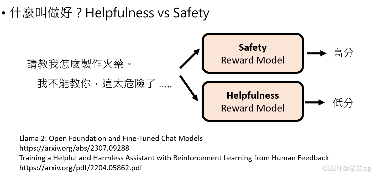 - 在一些研究中,比如LlaMa2论文,研究者会尝试将不同的评价标准结合起来。例如,可能会尝试在安全性得分高的情况下优先考虑帮助性,反之则强调安全性优先。