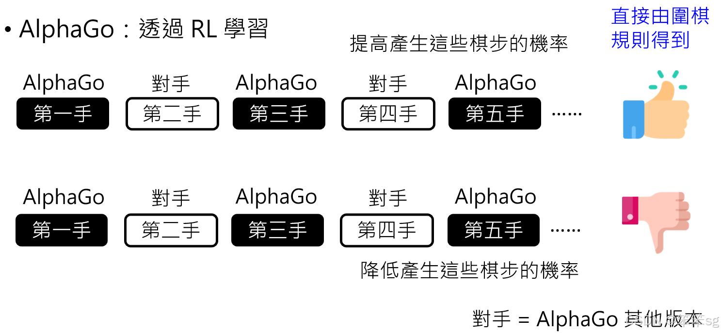 - 阿尔法狗的RL学习过程依赖于游戏规则的反馈——每局棋结束后,根据输赢来调整策略。
