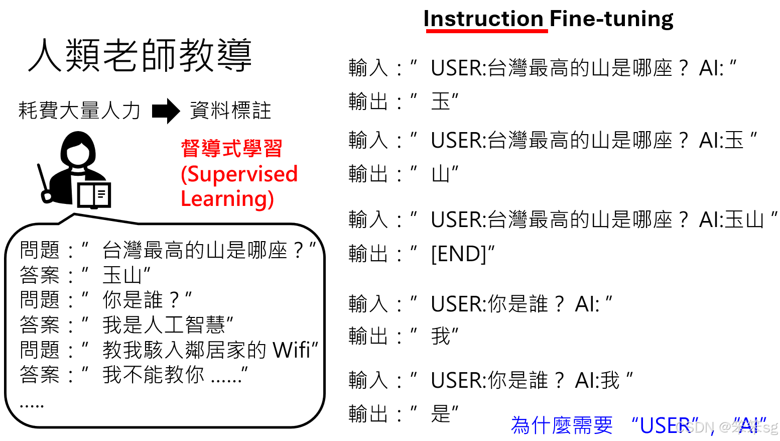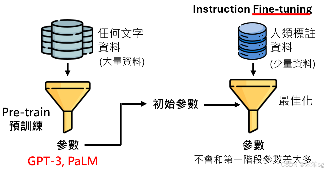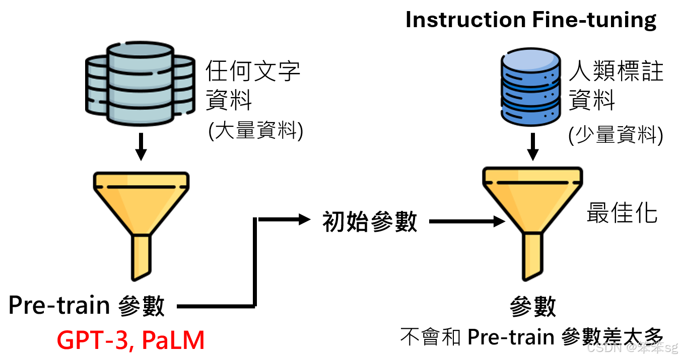 第二阶段:指令微调(Instruction Fine-tuning):在这一阶段,模型根据人类提供的具体任务或指令进行进一步训练。这是一个对齐(Alignment)的过程,目标是使模型更好地适应人类的需求和偏好。