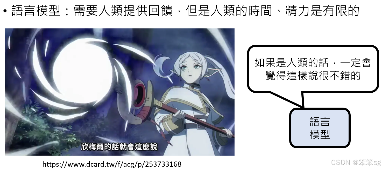 在类比到语言模型时,尤其是在人类反馈的应用上,这个想法非常有启发性。语言模型的回馈过程通常依赖于人类的直接评价,但如果能够通过创建一个“虚拟的回馈模型”,即通过模仿人类的价值观和判断来指导模型的行为,这将大大提高模型的学习效率。这个虚拟回馈模型不再直接依赖人类每次提供具体的反馈,而是通过内置的价值判断来模拟和生成人类可能的回应。就像福利莲通过回忆辛梅尔来决定如何应对复杂情况,语言模型也能通过内嵌的回馈机制,判断哪些行为是“人类认同的正确行为”,从而优化其输出。