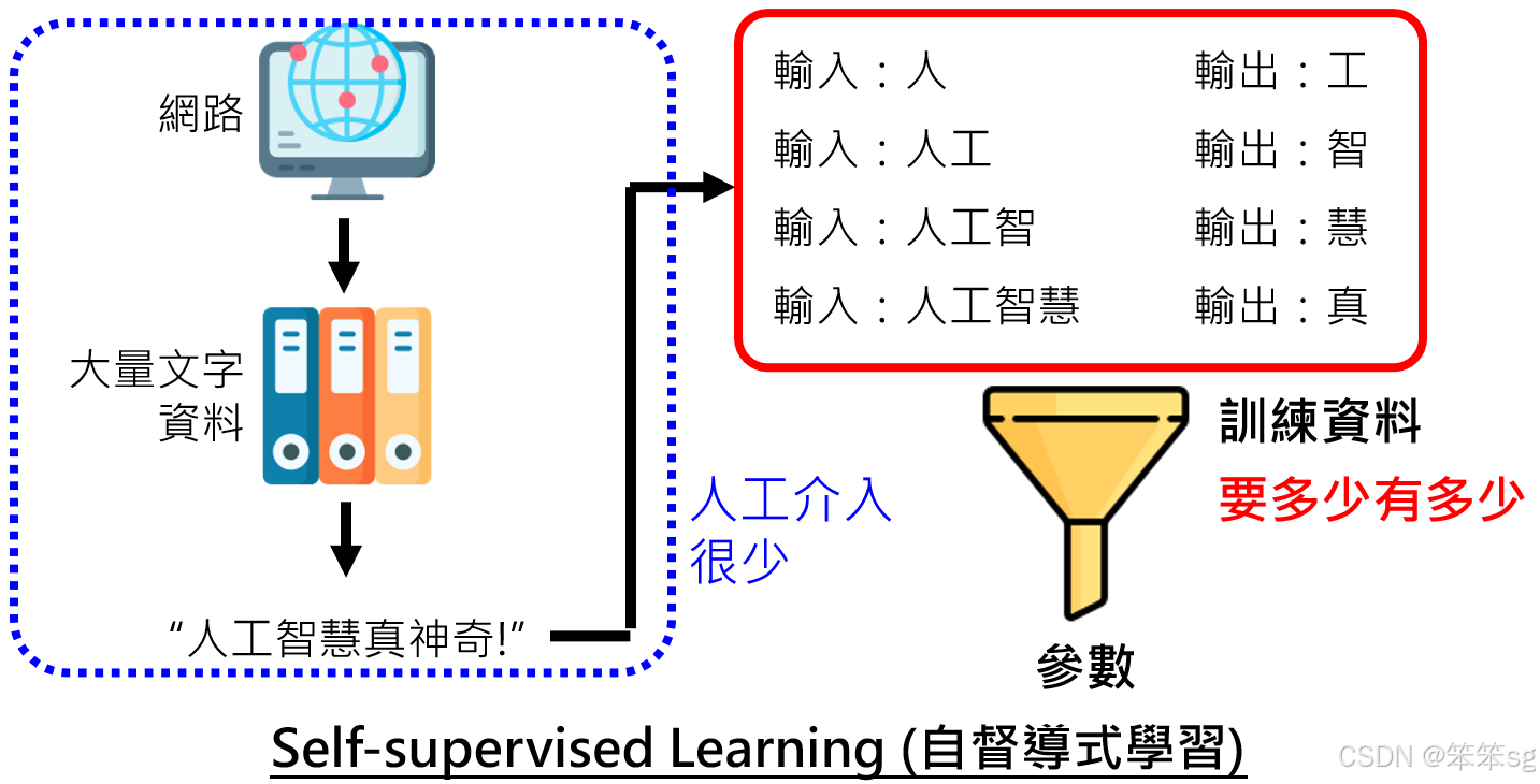 - 自监督学习的核心是机器通过自身的方式进行学习,不需要人为标注或者干预。它通过不断地将文本数据拆分、重组,学习如何根据前后文进行文字接龙,从而掌握语言模型的训练。