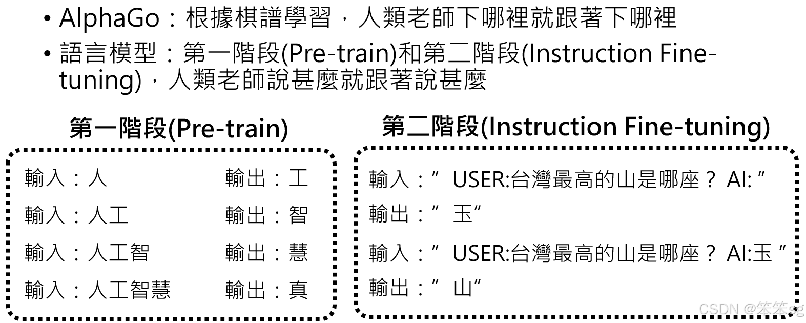 阿尔法狗和语言模型都经历了两阶段的学习过程。阿尔法狗的第一阶段是通过学习人类棋谱(类似于语言模型的预训练阶段)来模仿人类的行为,而第二阶段通过自我对弈的强化学习(RL)进行优化。同样,语言模型也经历了预训练和微调阶段(第一阶段),在预训练阶段通过大量的文本数据学习语言的基本规律,而在微调阶段通过人类提供的反馈(比如instruction tuning)进行优化,在第二阶段则通过RLHF进行优化。
