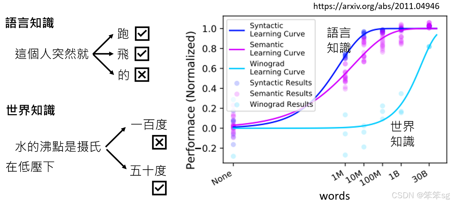 - 除了语言知识,语言模型还需要学习世界知识,以理解某些词汇和句子的语境。例如,理解水的沸点是100度而不是50度。