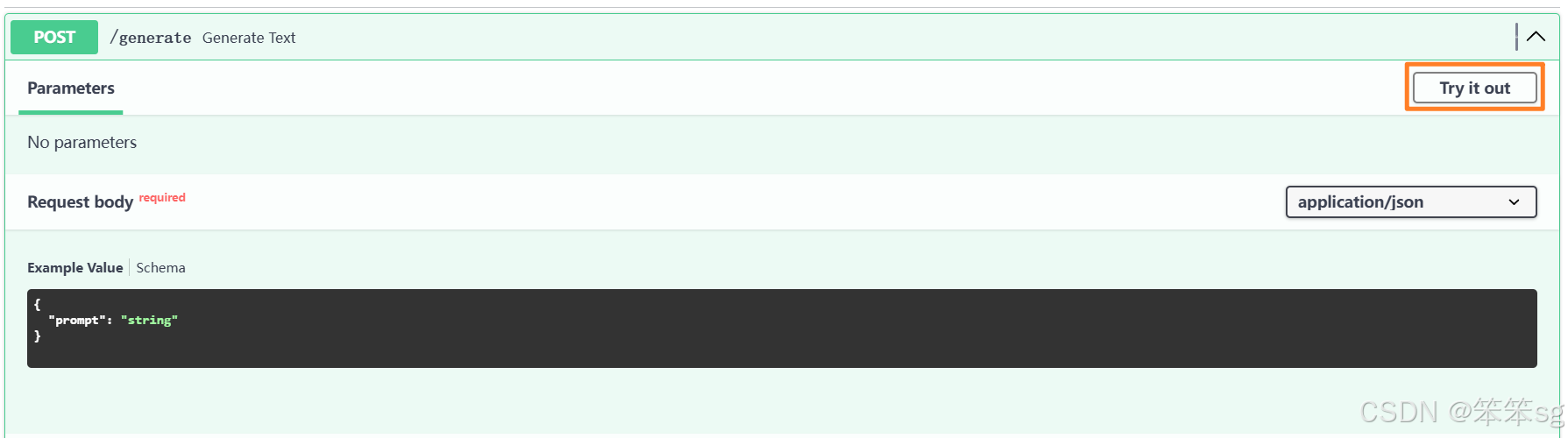 你可以点击 POST /generate,然后点击 Try it out 直接测试 API: