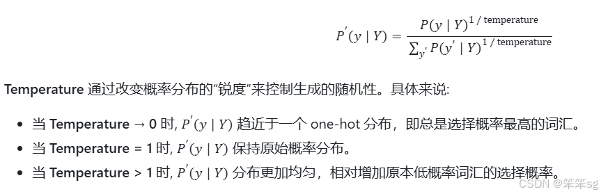 - 当 temperature < 1 时,概率分布变得更加尖锐,高概率词更可能被选择,适用于需要高确定性的任务,如生成技术文档或代码。
