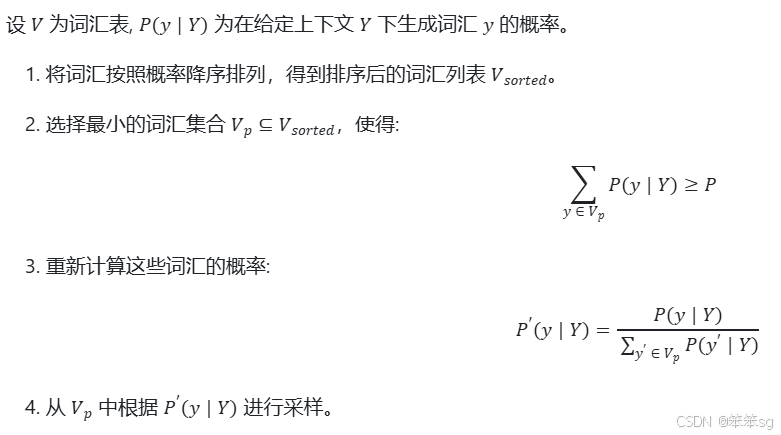 - 重新归一化: 将筛选后的词汇概率重新归一化。