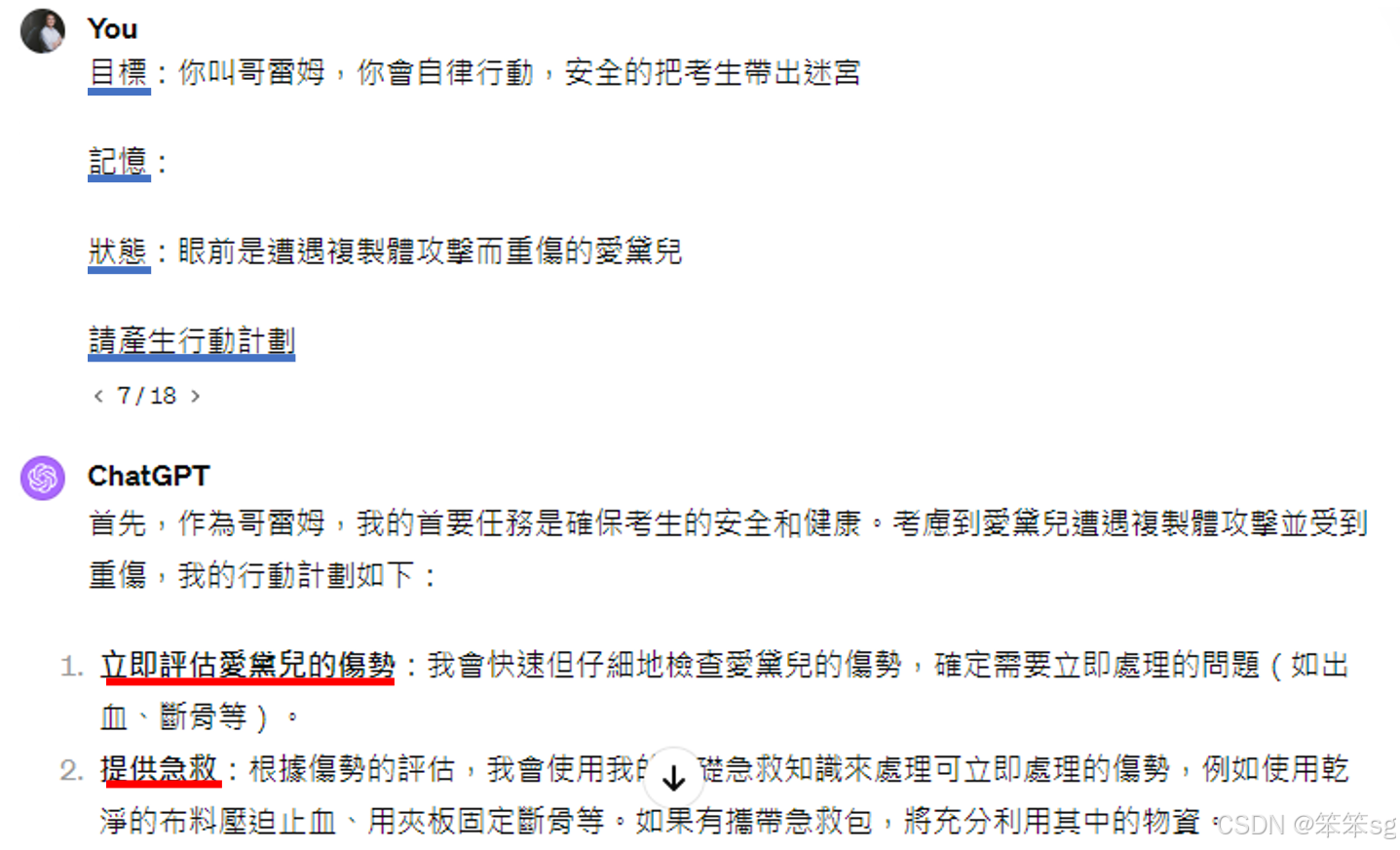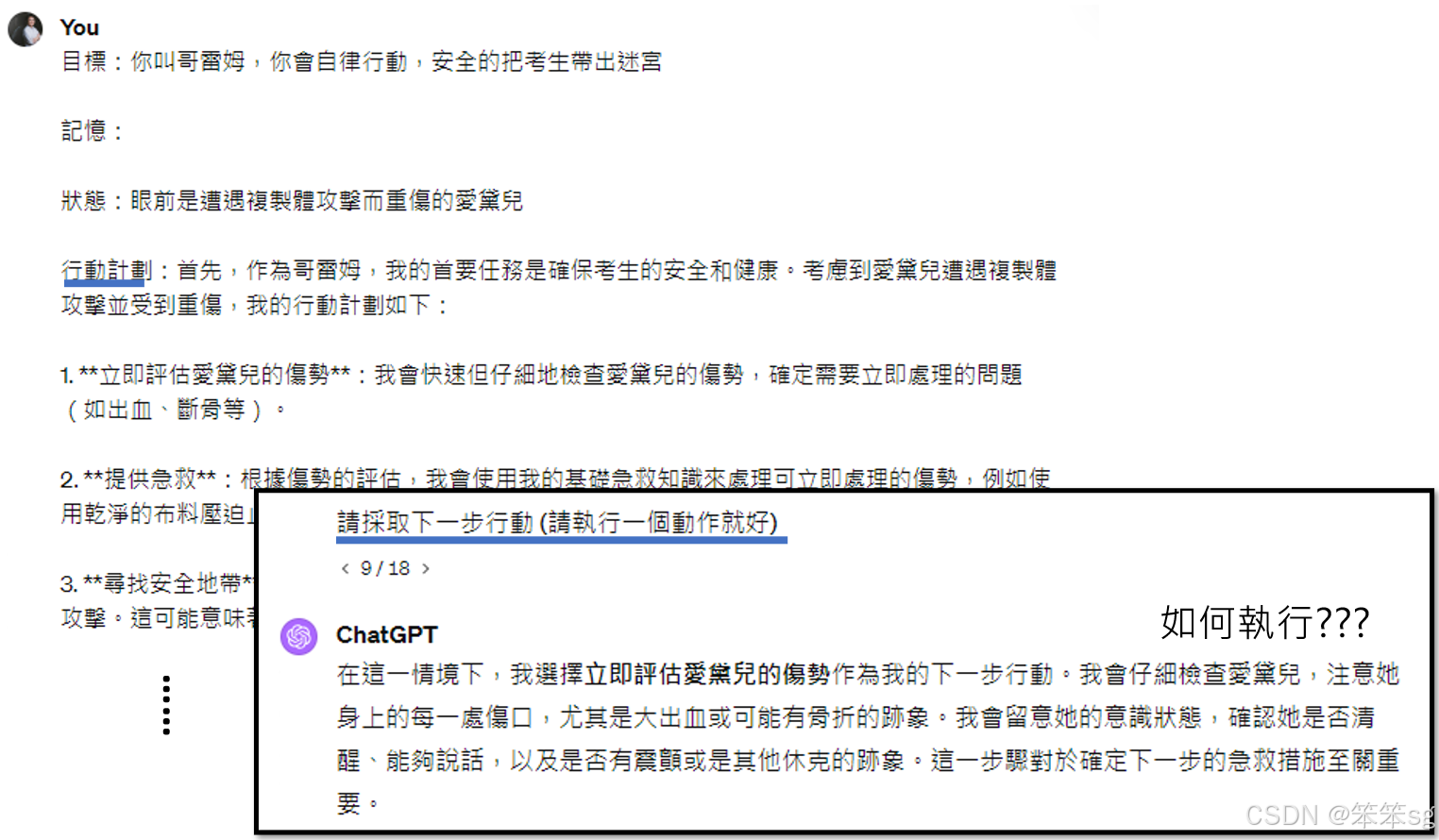 - 输入信息和决策:格列姆的决策过程基于当前的环境状态和其目标。例如,它知道艾黛尔受伤,因此其任务是帮助艾黛尔评估伤势、提供急救等。这些行动通过语言模型生成的文字指令来表示,如“立即评估伤势”,“施予急救”等。