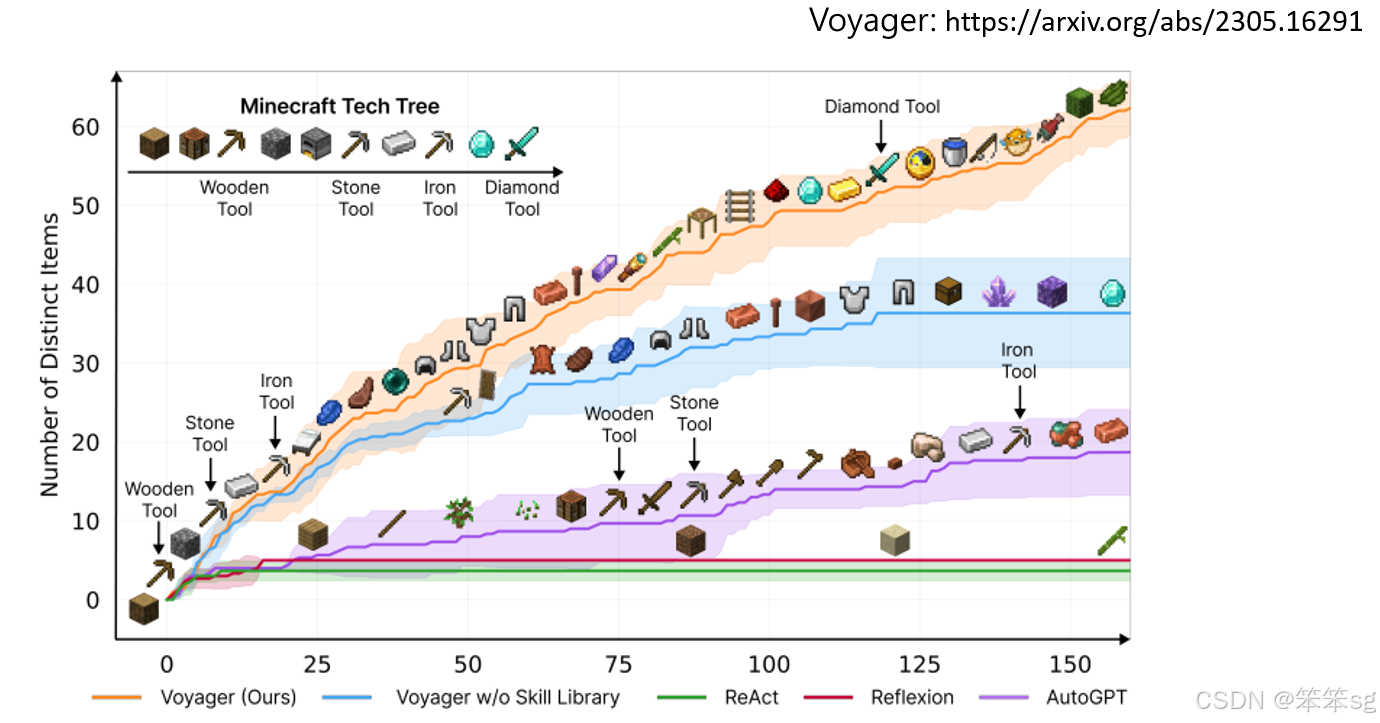 除此之外,还有让AI在Minecraft中进行自我探索和学习。比如,在《Voyager》论文中,AI通过不断的探索,学会了使用木质工具、十字工具、铁器工具,并最终学会打造钻石剑。随着学习的不断积累,AI变得越来越强,能够完成更多任务。这展示了AI在虚拟世界中的自我学习能力。