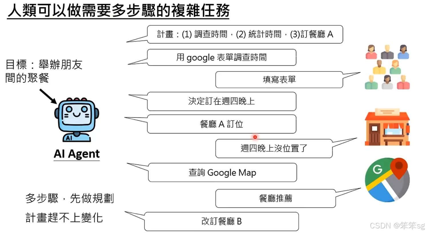 今天的讨论重点是如何让AI执行多步骤的复杂任务。举个例子,假设我要举办朋友间的聚餐,这个任务包含多个步骤:首先需要调查大家的空闲时间,然后根据调查结果选择餐厅,并进行预订。如果餐厅没有位置,还需要查询其他餐厅并进行调整。这些步骤需要有序进行,并且在执行过程中,计划可能会发生变化。