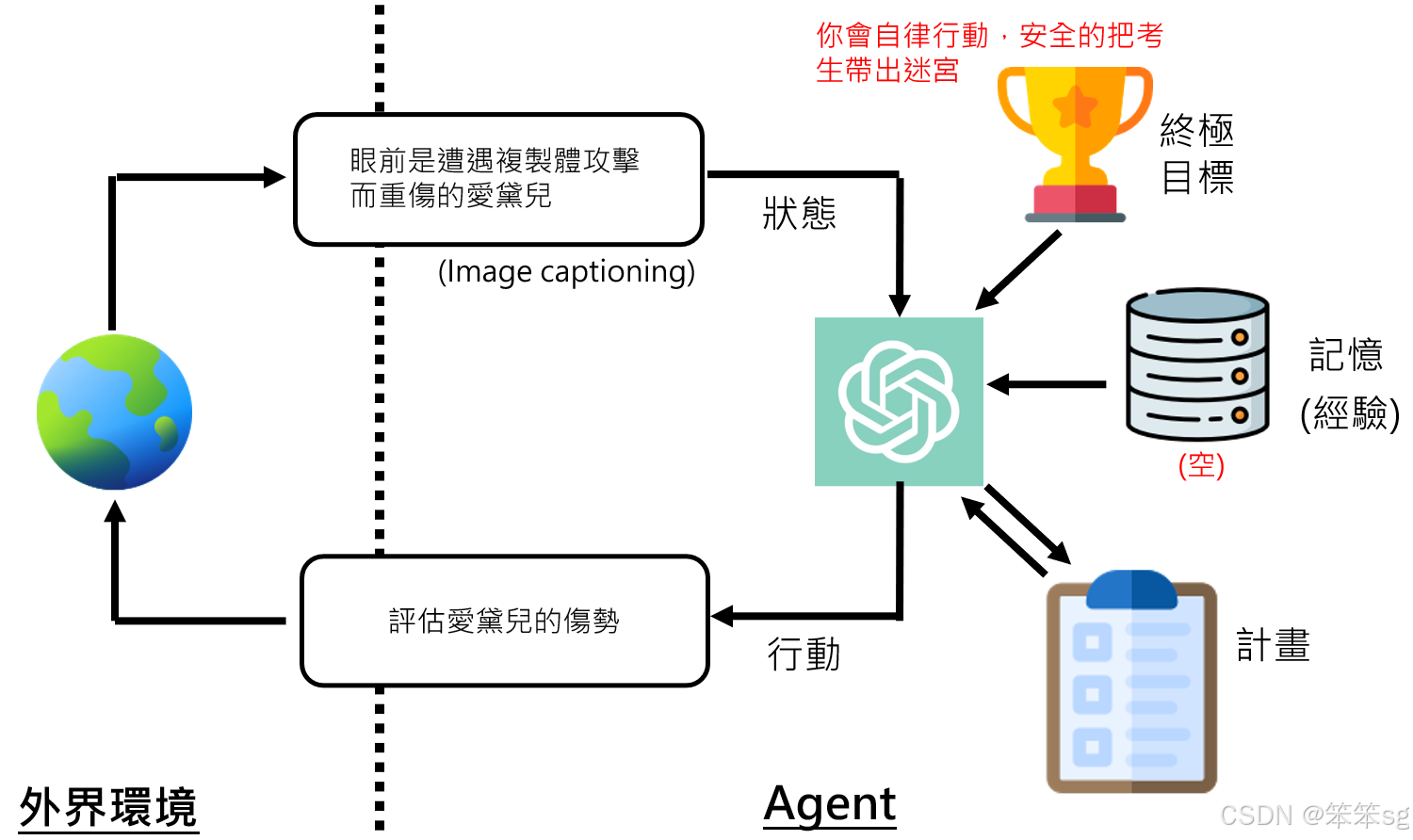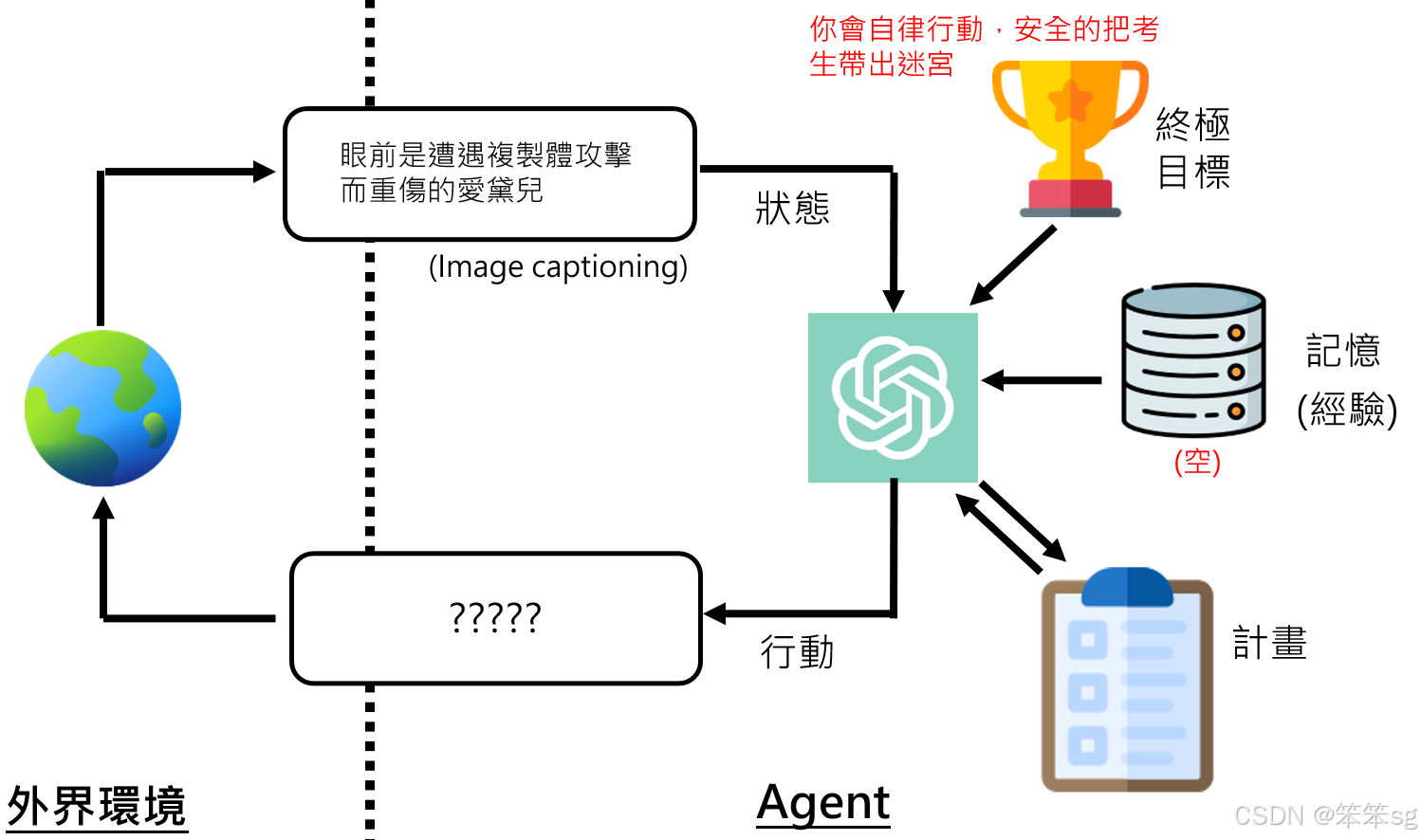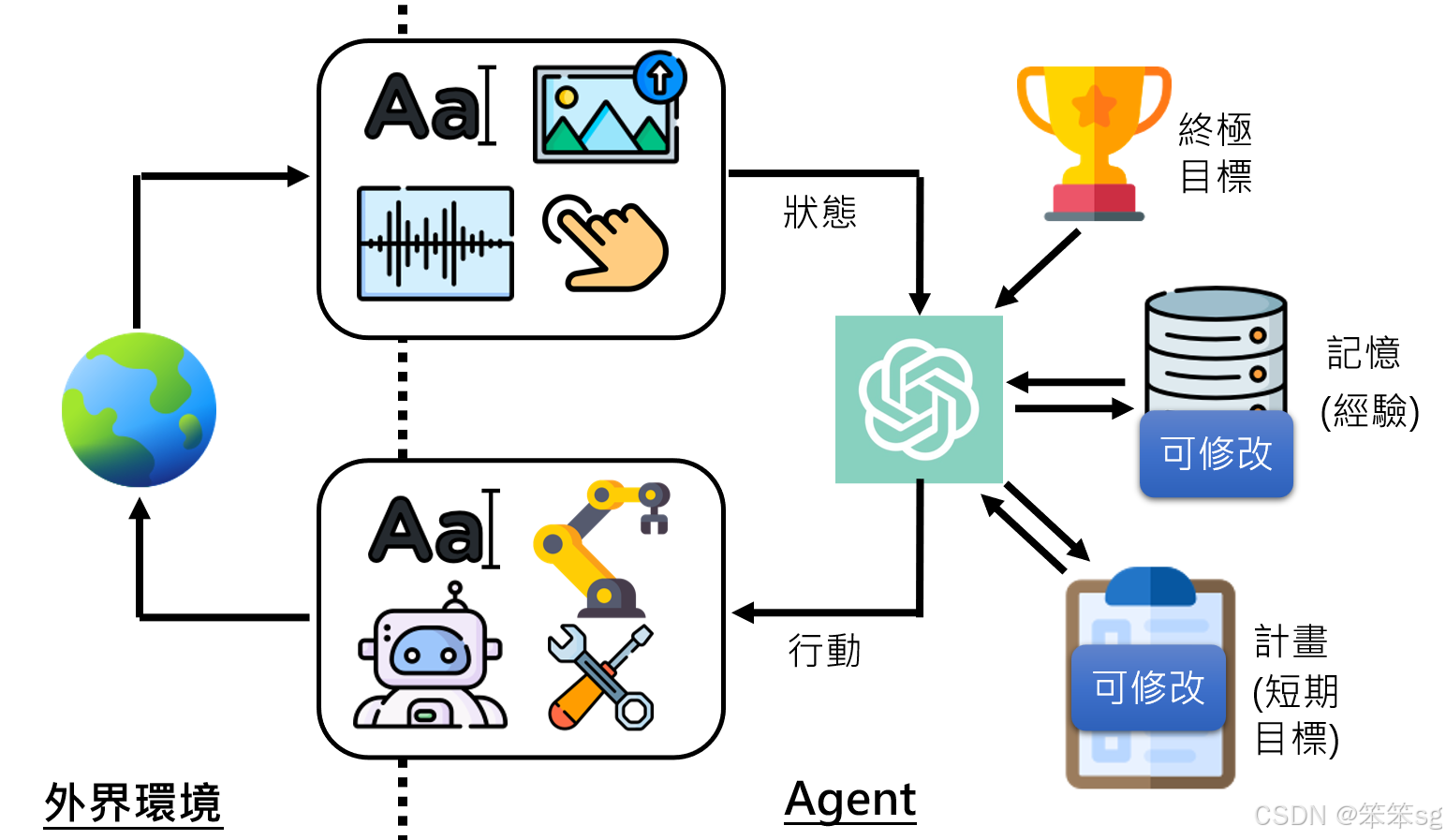 感知外界:AI agent能够通过各种感知器(如文字输入、视觉、听觉、触觉等)了解外界的状态。这些感知器可以帮助AI获取当前的环境信息。