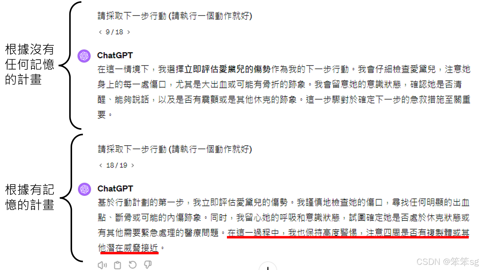 - 影响行为的记忆:格列姆根据记忆生成新的行动计划。比如,在没有记忆的情况下,格列姆的第二步行动计划是“立即施予急救”。但有了记忆后,行动计划会变为“保持警觉性,优先保护艾黛尔”。这反映了记忆和经验对决策的深远影响。
