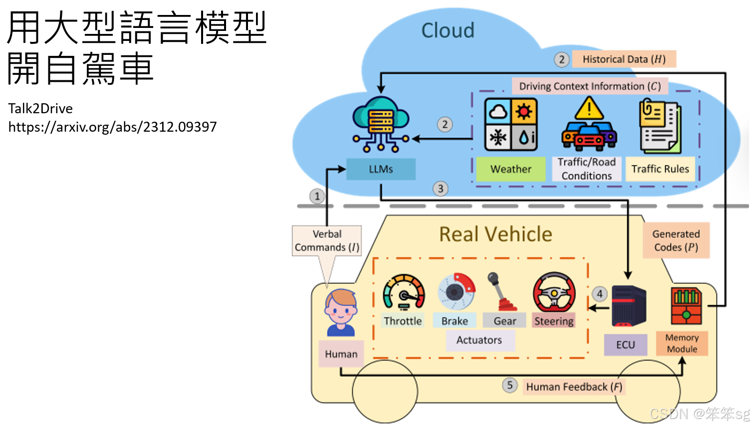 另一个例子是自驾车领域,论文《Talk2Drive》展示了如何利用大型语言模型来开自驾车。司机给出指令后,语言模型会根据环境信息(如天气、交通状况等)生成程序代码,通过这些代码来控制自驾车的各个部分。驾驶过程中,人类也可以提供反馈,帮助AI模型不断调整决策。这些示例表明,语言模型不仅能在虚拟环境中自我学习,还能够与现实世界进行互动并执行复杂任务