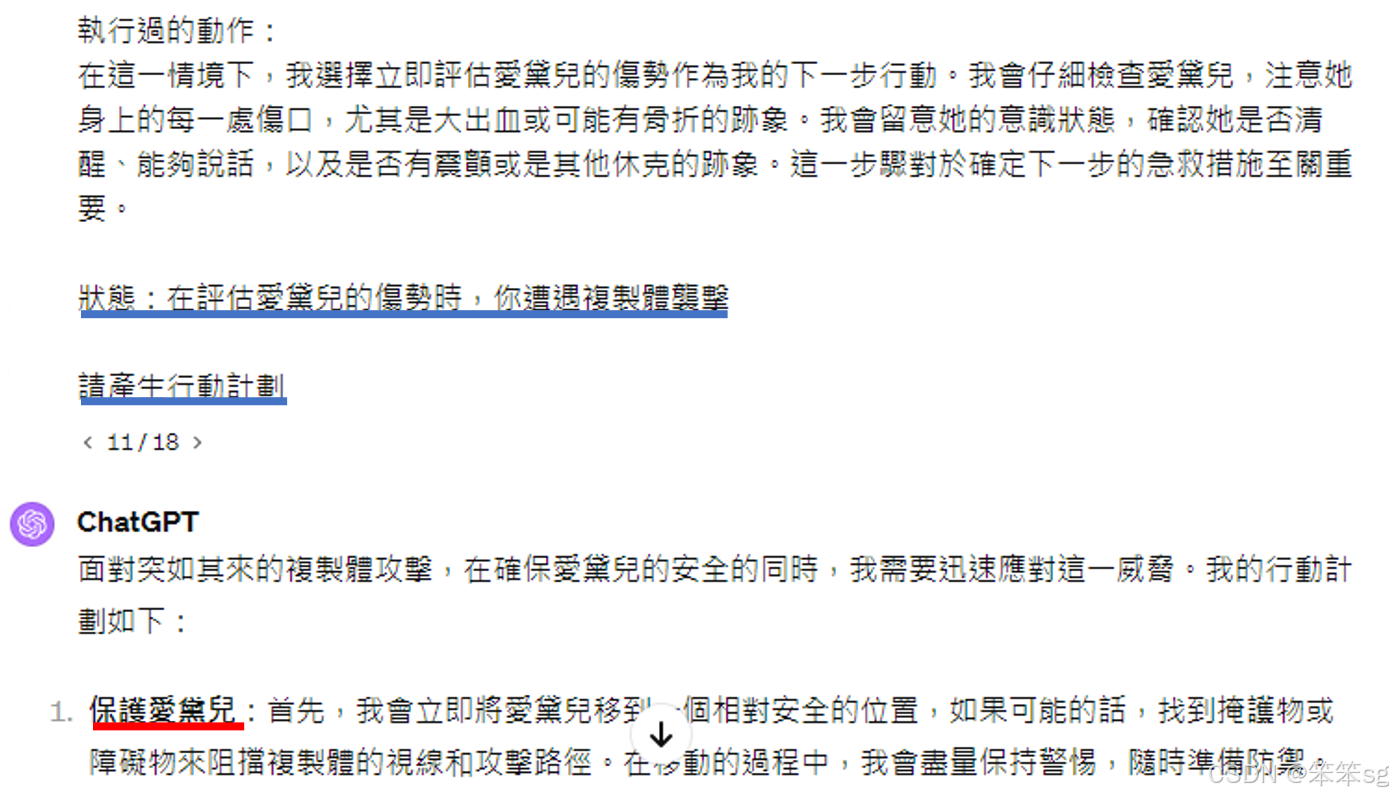 - 动态调整行动计划:在格列姆执行行动时,外部环境可能会发生变化。例如,在评估艾黛尔伤势时,格列姆遇到了敌人攻击,外部威胁增加了。这时,格列姆必须调整其行动计划,优先保护艾黛尔,而不是继续评估伤势。语言模型能够根据新的环境变化自动调整原有的计划,以应对突发情况。