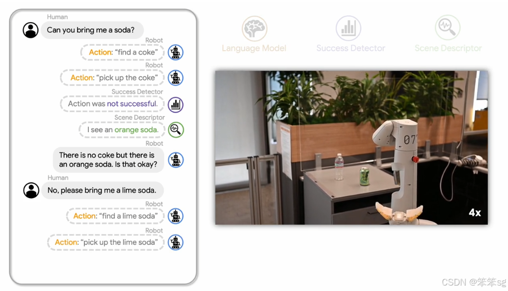 不过,值得注意的是,使用语言模型来操控机器人并不是新鲜的概念。早在2022年,就有论文《Inner Monologue》提出了语言模型与机器人结合的思路,机器人通过语言模型接受指令并自主思考解决问题的过程。