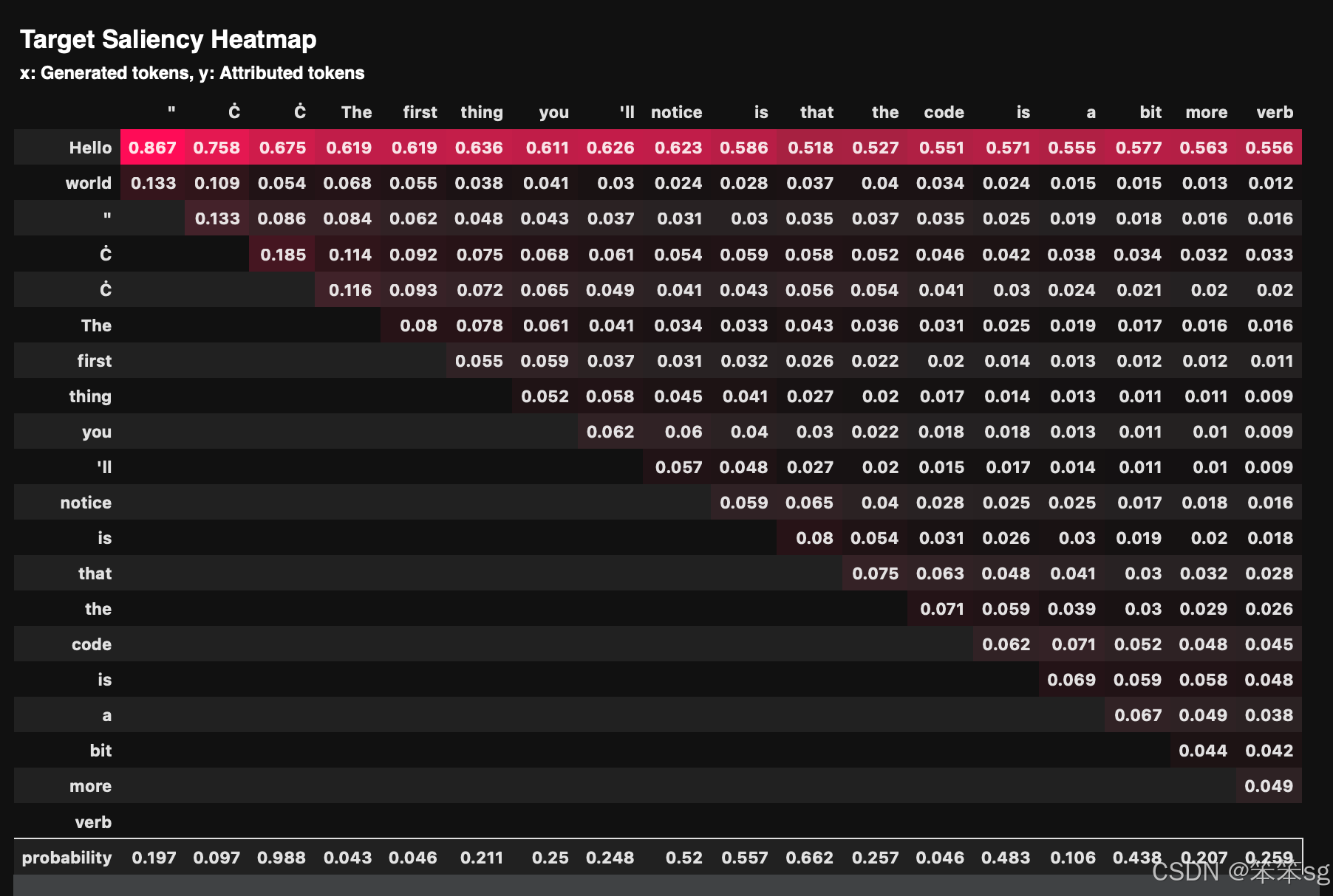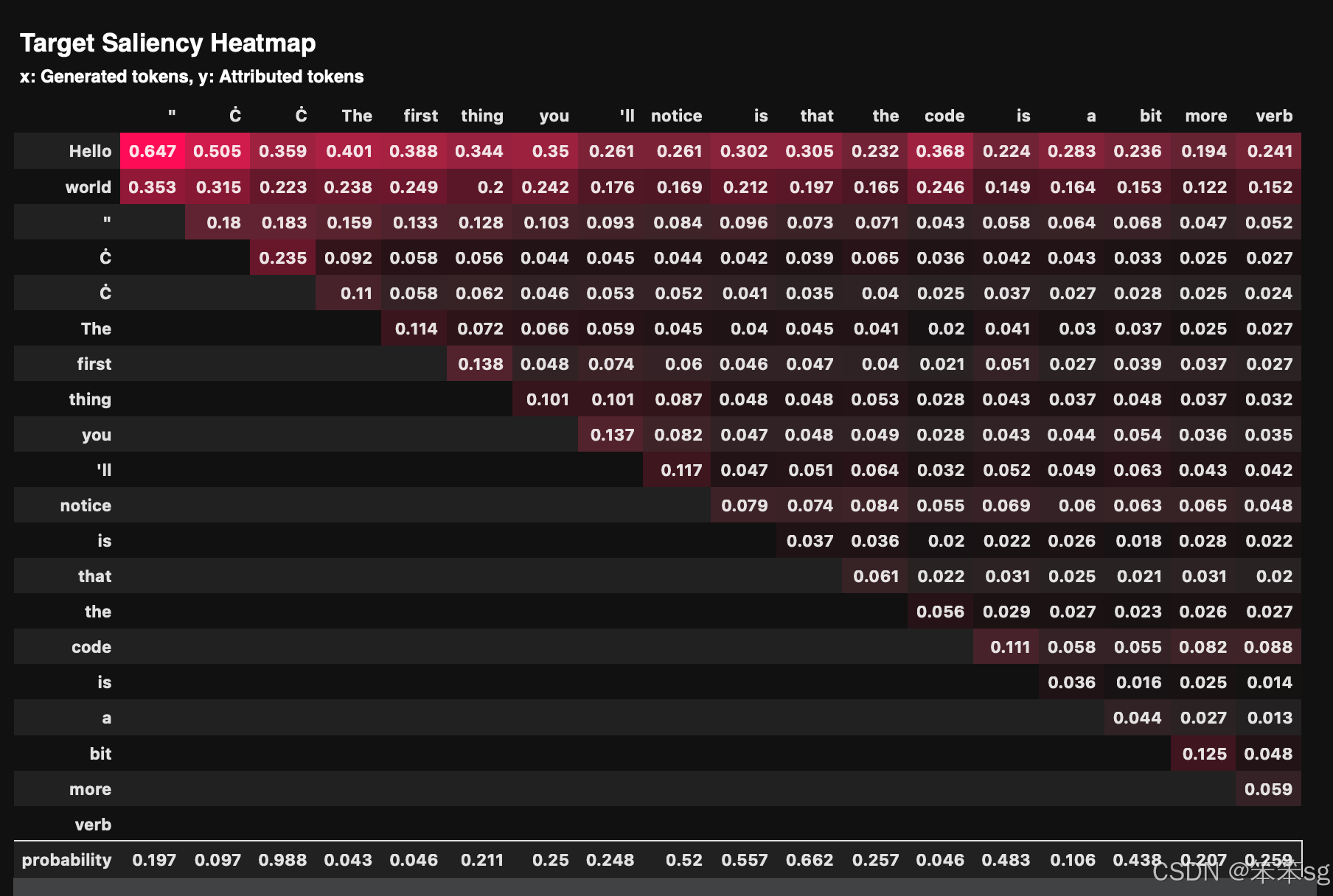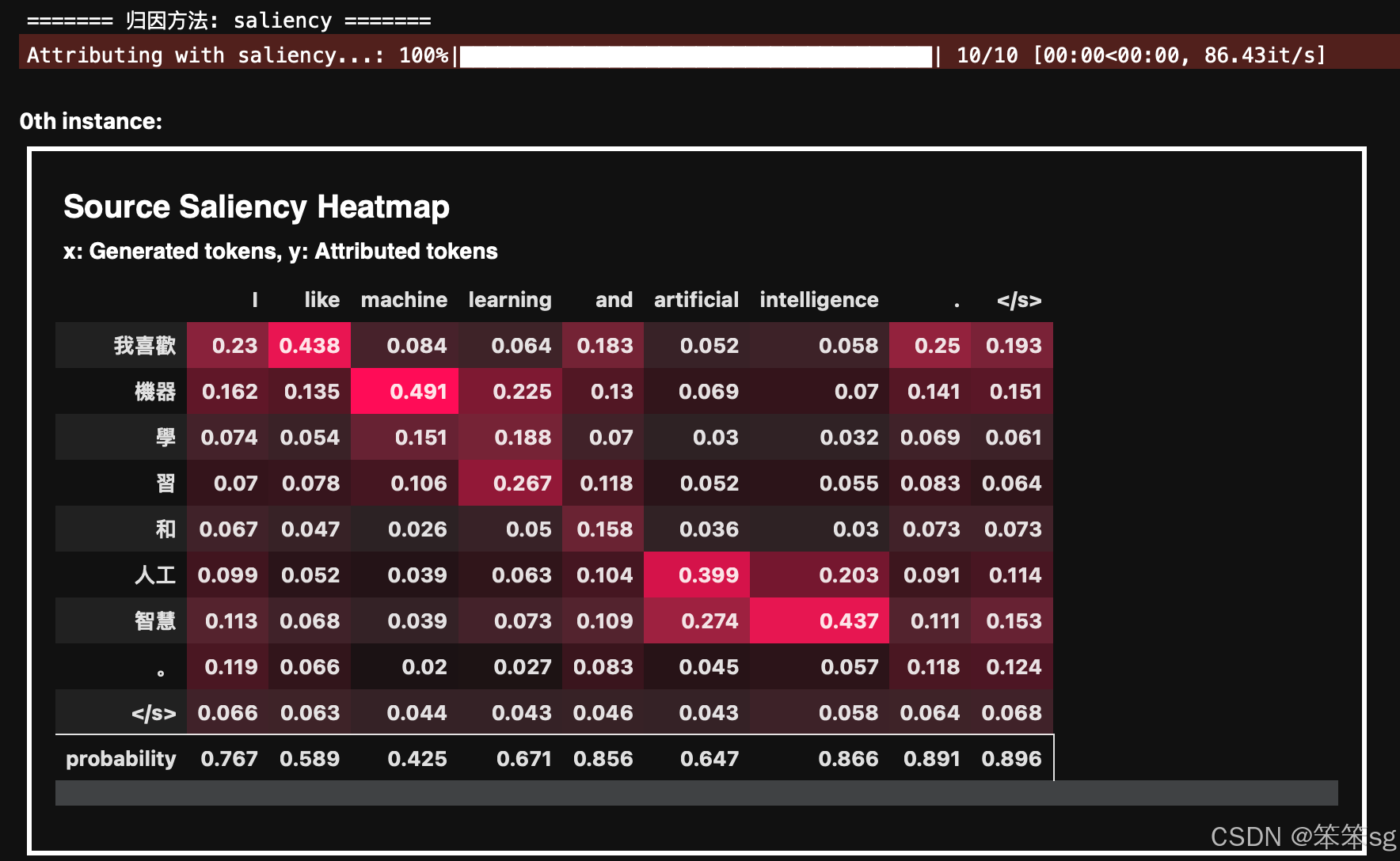 Saliency 方法 通过计算输入对输出的梯度,衡量输入 token 对生成输出的影响程度。你可以看到生成的每个输出 token 是如何受到输入 token 的影响的,比如: I like 受 我喜欢 的影响最大。