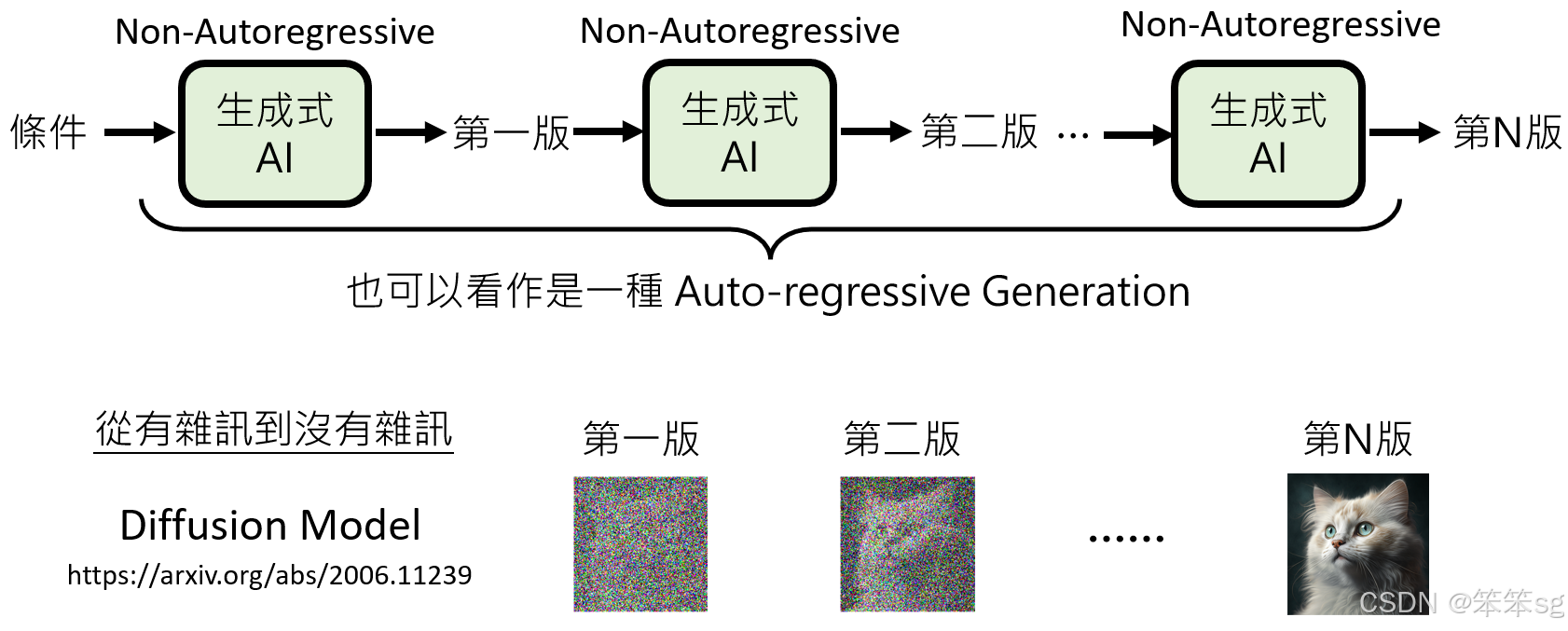 - 例如,在图像生成中,AR模型生成的是一个粗略的草图或低分辨率的版本,确定了整体框架(比如,图像的主题、色调和大体结构)。然后,NAR模型基于这个草图进行细化,生成高分辨率的最终图像。