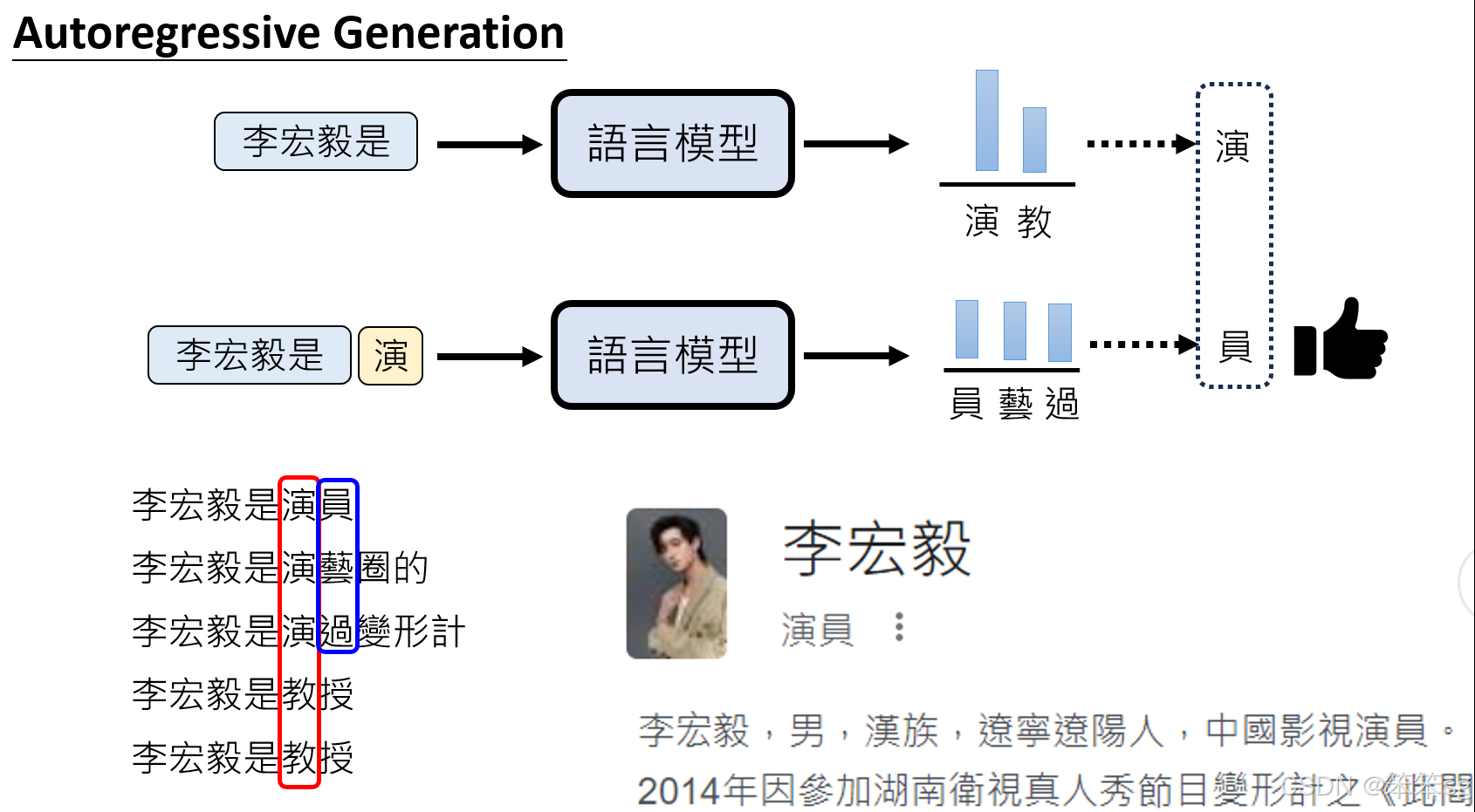 逐步生成和上下文依赖性: Auto-Regressive模型逐步生成每个token,且每个token的生成都依赖于前面已生成的内容,这使得模型能够保持生成内容的连贯性和一致性。例如,在你给出的“李宏毅”例子中,AR模型首先生成“李宏毅是演”,然后再生成后续内容,如“演员”或“教授”,确保语句的连贯性。模型根据训练数据的统计信息做出合理选择,并且每一步都考虑到前文的生成内容,从而避免了出现不连贯或不合逻辑的结果。