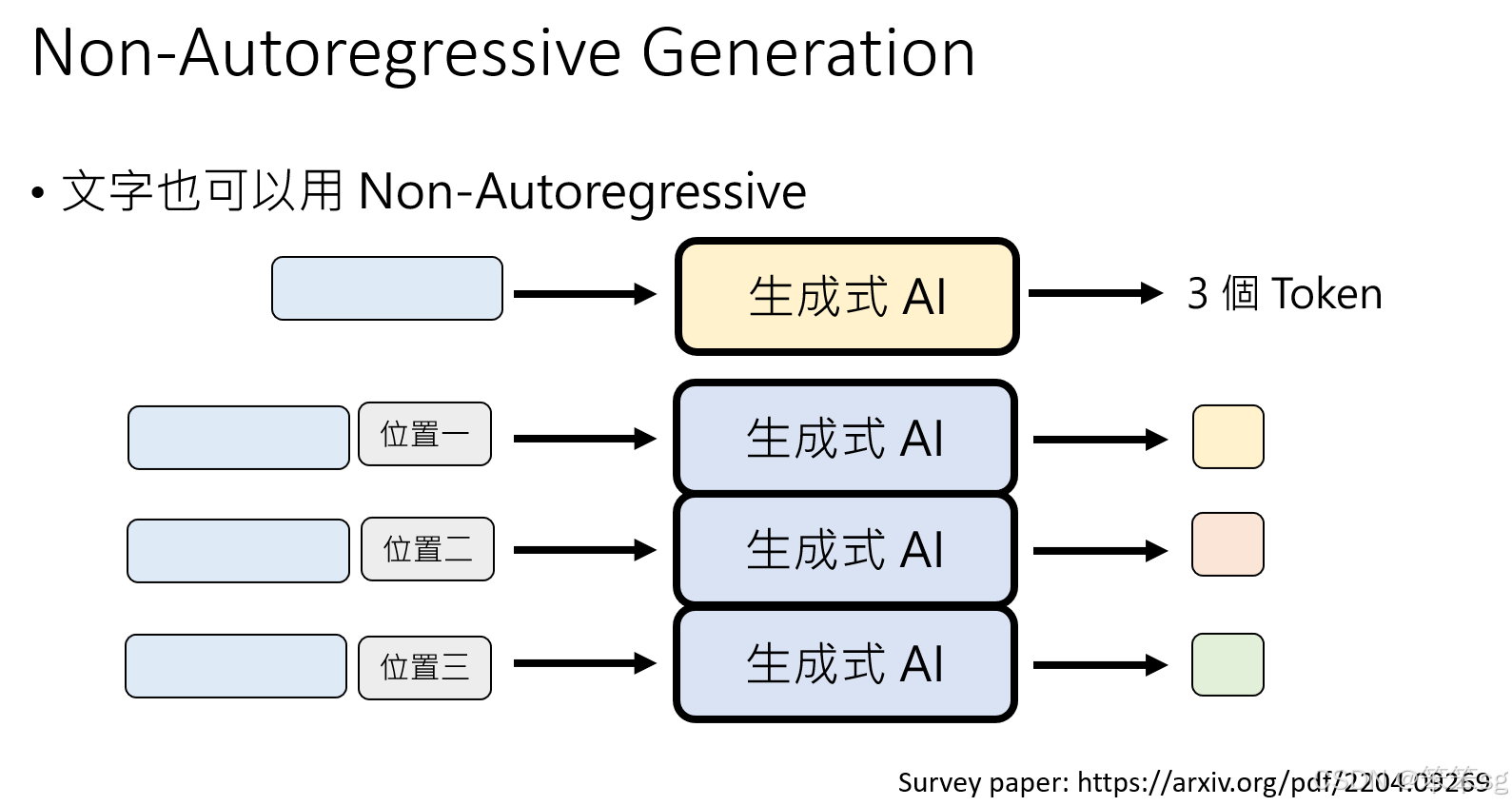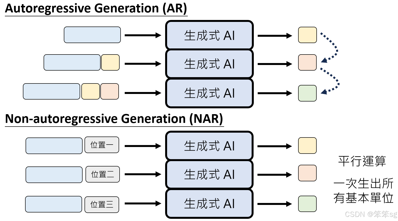 Non-Auto-Regressive模型的局限性: Non-Auto-Regressive(NAR)模型可以并行生成,速度较快,但它存在一个问题——生成时容易脑补不一致,导致输出不符合预期。因此,NAR在精度上可能不如AR。