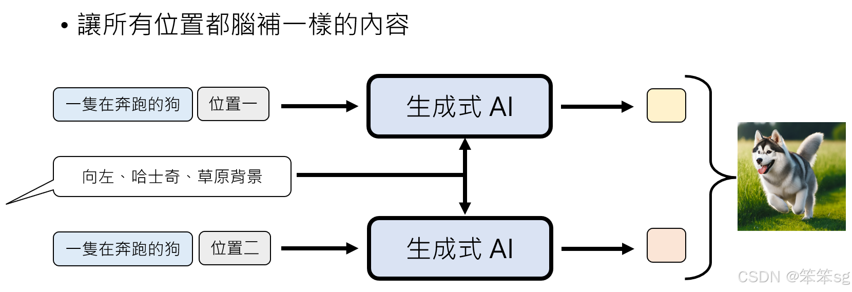 解决办法:提供更多的上下文: 就是在图像生成时,通过额外提供信息,让模型从一开始就知道如何生成整个图像。例如,输入不仅仅是“要画一只在奔跑的狗”,而是附加更多的描述性信息,比如这只狗是“向左奔跑的哈士奇,背景是草原”。这样,模型在生成每个像素时都有统一的脑补内容,不会出现不一致的生成。