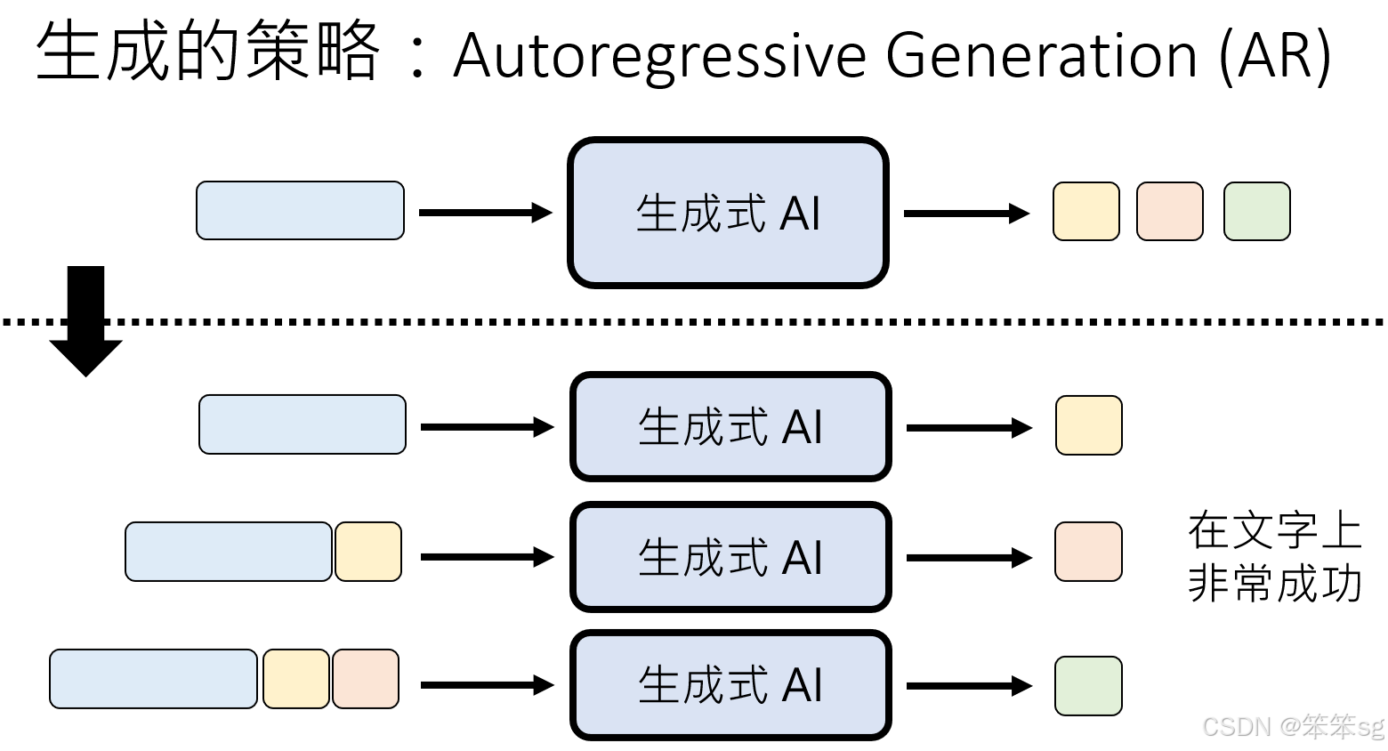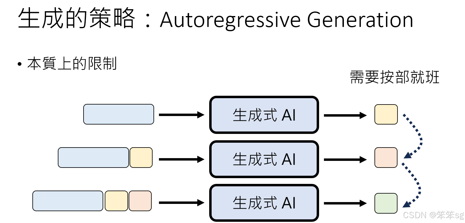 - 每次只生成一个基本单位(如 token、像素、sample)。