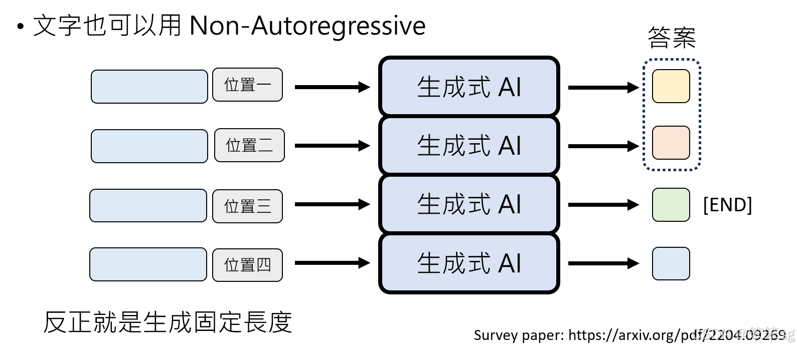 方法:另一种方式是,告诉语言模型生成一个固定长度的输出(如1~1024个token),无论输入是什么,模型都一次性生成该长度的文本。生成完之后,可以根据特定符号(如 "END")进行筛选,删除生成文本中多余的部分,只保留有意义的部分作为最终输出。