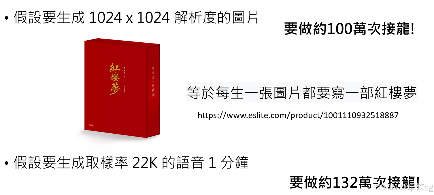 - 生成高分辨率图片或高采样率语音需要大量迭代,例如: