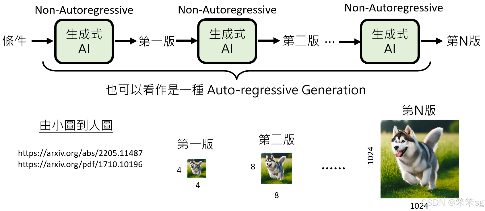 这是一种通过将生成过程分解为多个阶段,每个阶段都使用nauto-regressive模型生成结果的方法。每个阶段的生成会依赖前一个阶段的结果,并且每次生成的版本之间差异较小,因此可以避免不一致的“脑补”问题。